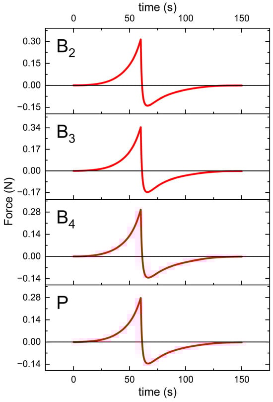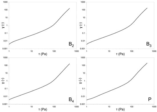 The stress ramp test was conducted over a shear stress range of 1.0–500.0 Pa, with a total test duration of 60 s. During the measurement, 180 data points were recorded. The results were plotted as strain versus shear stress on a logarithmic scale.