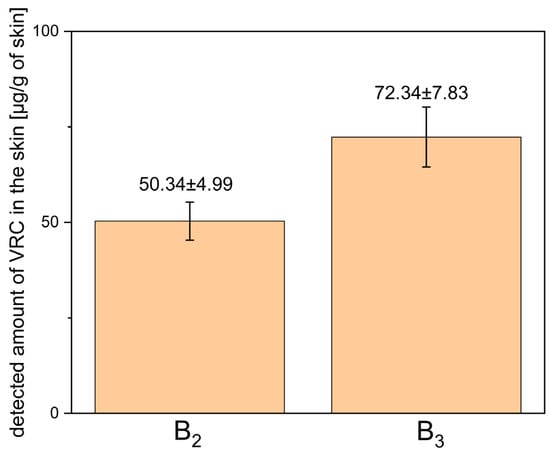 A review of the available literature did not reveal any studies assessing VRC penetration and deposition in full-thickness human skin, precluding direct comparison of our findings with previously published data. Nevertheless, considering the established MIC breakpoints for VRC against Candida species (susceptible ≤1 μg/mL; susceptible dose dependent 2 μg/mL; resistant ≥4 μg/mL) [], it can be stated that the VRC concentrations achieved in the skin from both B2 and B3 far exceed these thresholds. However, it must be acknowledged that tissue concentrations are expressed in μg/g of tissue, whereas MIC values are expressed in μg/mL of inoculum. Moreover, MIC values inherently refer to the unbound fraction of the drug, whereas VRC deposited in the skin may also be present in a protein-bound state.