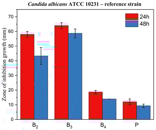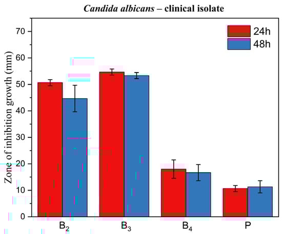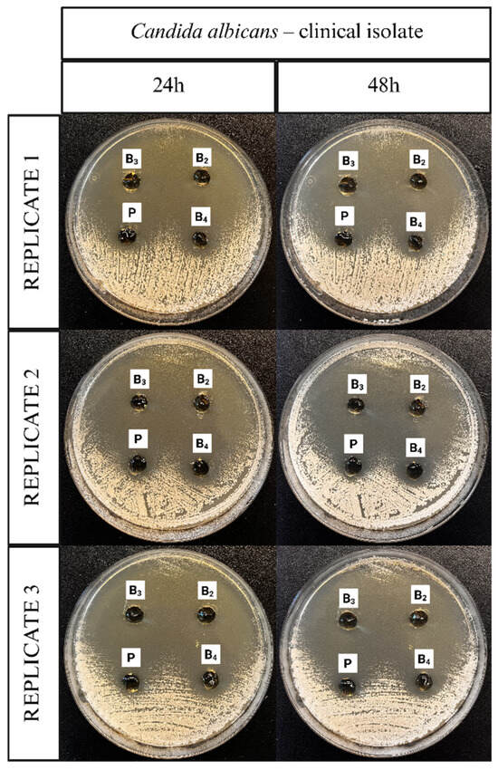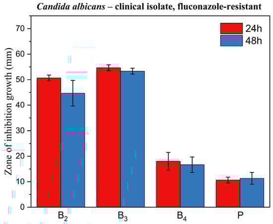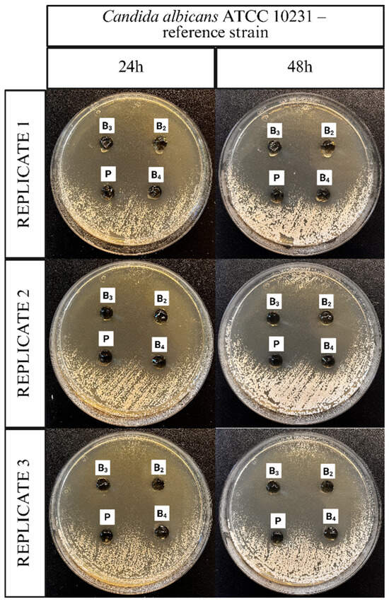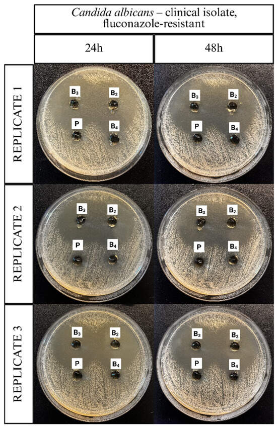 The antifungal activity of ME-based polymer gels was assessed against standard (ATCC 10231) and clinical strains (including the fluconazole-resistant strain) of Candida albicans using the agar diffusion method. The inhibition zone was measured to determine the activity of VRC delivered via the topical systems against Candida albicans. All of the fungal strains were cultured on Malt extract agar (Merck KGaA, Darmstadt, Germany) under aerobic conditions for 24 h and at 36 ± 1 °C. Following incubation, the cultures were resuspended in a 0.85% NaCl solution. The turbidity of the suspension was measured using a Grant-Bio DEN-1 Benchtop Densitometer (Riga, Latvia) and adjusted to a value of 0.7 McFarland units (corresponding to approximately 2.0 × 106 CFU/1 mL for C. albicans; CFUs—Colony Forming Units). Then, a sterile cotton swab was dipped into the suspension and evenly spread over the entire surface of the agar plate by swabbing in three directions. Next, the wells of 6 mm in diameter were punched aseptically with a sterile pipette tip, and 0.1 mL of the gel was applied manually to the well. The study involved four different gels—B2, B3, B4, and placebo (P) (Table 2). The plates were incubated at 36 ± 1 °C. The inhibition zones were measured at 24 and 48 h using a ruler with an accuracy of 1 mm to evaluate fungal growth inhibition. All assays were determined in triplicate to evaluate the mean and standard deviation (SD).
