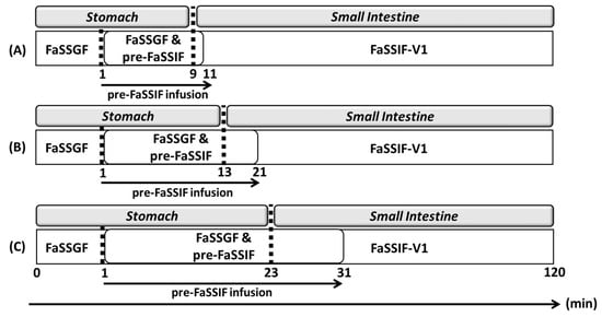 - Kambayashi, A.; Yasuji, T.; Dressman, J.B. Prediction of the Precipitation Profiles of Weak Base Drugs in the Small Intestine Using a Simplified Transfer (“Dumping”) Model Coupled with In Silico Modeling and Simulation Approach. Eur. J. Pharm. Biopharm. 2016, 103, 95–103. [Google Scholar] [CrossRef]