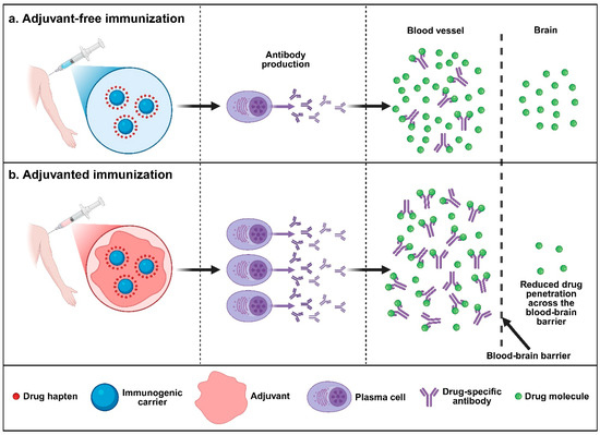 Adjuvants enhance the immunogenicity and protective efficacy of SUD vaccines. (a). Adjuvant-free immunization elicits a modest drug-specific antibody response and affords limited protection. (b). By contrast, adjuvanted immunization induces robust antibody production and more effectively prevents drug entry into the brain. This figure was created in BioRender.com.