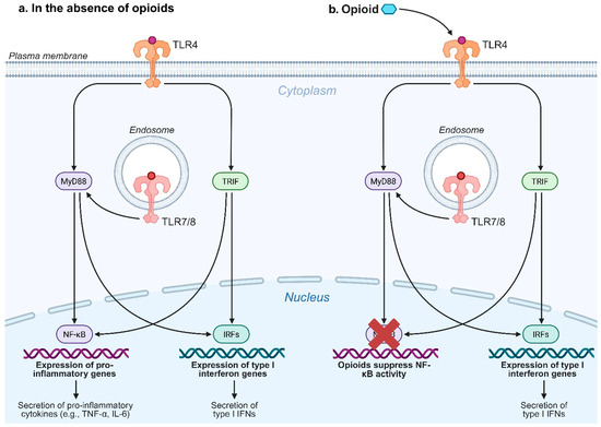 Modulation of TLR signaling by opioids. (a). In the absence of opioids, ligand engagement of TLR4 recruits the adaptor proteins MyD88 and TRIF, whereas TLR7/8 signals exclusively through MyD88. These signaling pathways lead to the NF-κB-dependent expression of pro-inflammatory cytokines (e.g., TNF-α, IL-6) or activate IRFs that induce type I IFN genes. (b). Opioids non-competitively attenuate the TLR4-induced NF-κB activation (red cross), reducing pro-inflammatory cytokine production. Arrows indicate direction of signal propagation. This figure was created in BioRender.com (modified from the template TLR Signaling Pathway).