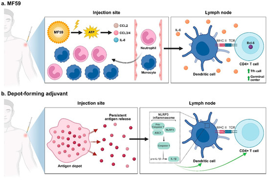Divergent immunological pathways engaged by MF59 and depot-forming adjuvants. (a). MF59, a squalene O/W emulsion, provokes a transient release of extracellular ATP that elicits a burst of chemokines (CCL2, CCL3/4, IL-8). The resulting gradient rapidly attracts neutrophils and inflammatory monocytes to the injection site. Recruited monocytes differentiate into CD11c+ dendritic cells that migrate to the draining lymph node, where they present peptide-MHC class II complexes in an IL-6-rich milieu. IL-6 up-regulates Bcl-6 in newly primed CD4+ T cells, expanding the Tfh pool and amplifying germinal center B-cell reactions. (b). Depot-forming adjuvants retain antigen at the injection site and activate the NLRP3 inflammasome in APCs. Activated caspase-1 cleaves pro-IL-1β into mature IL-1β, which feeds back on APCs and CD4+ T cells to enhance immune priming and differentiation. This figure was created in BioRender.com.