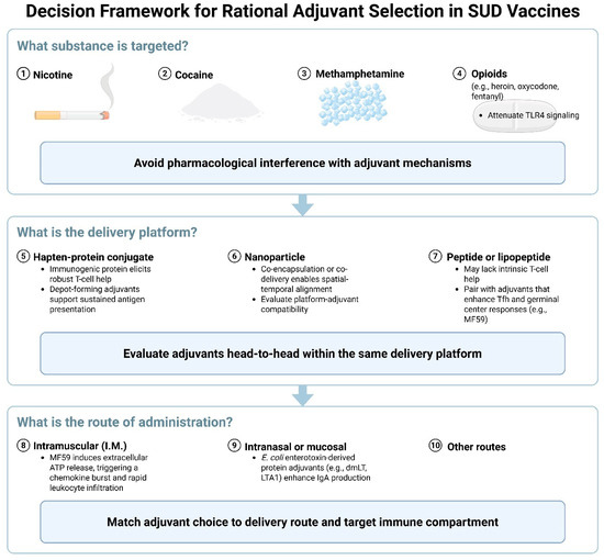 Evidently, adjuvant performance in SUD vaccines is best interpreted as conditional on both drug biology and formulation context. Findings with strong support include MF59 enhancing leukocyte recruitment and Tfh support for peptide or lipopeptide constructs and CpG in combination with Alum improving antibody response in several stimulant and nicotine models. Effects that vary by context include reduced utility of TLR4 agonists in opioid settings and limited added value from MF59 when carrier proteins already provide strong T cell help and antigen persistence is the limiting step. Positive synergies are most likely when antigen and innate cues are co-localized and mechanistically complementary rather than duplicative. Because most evidence is preclinical and head-to-head evaluations within identical backbones remain uncommon, these conclusions should be treated as evidence-weighted patterns rather than universal rules. To support context-specific adjuvant selection in SUD vaccine development, Figure 4 presents a decision framework. It integrates key design questions and considerations related to substance class, delivery platform, and route of administration.