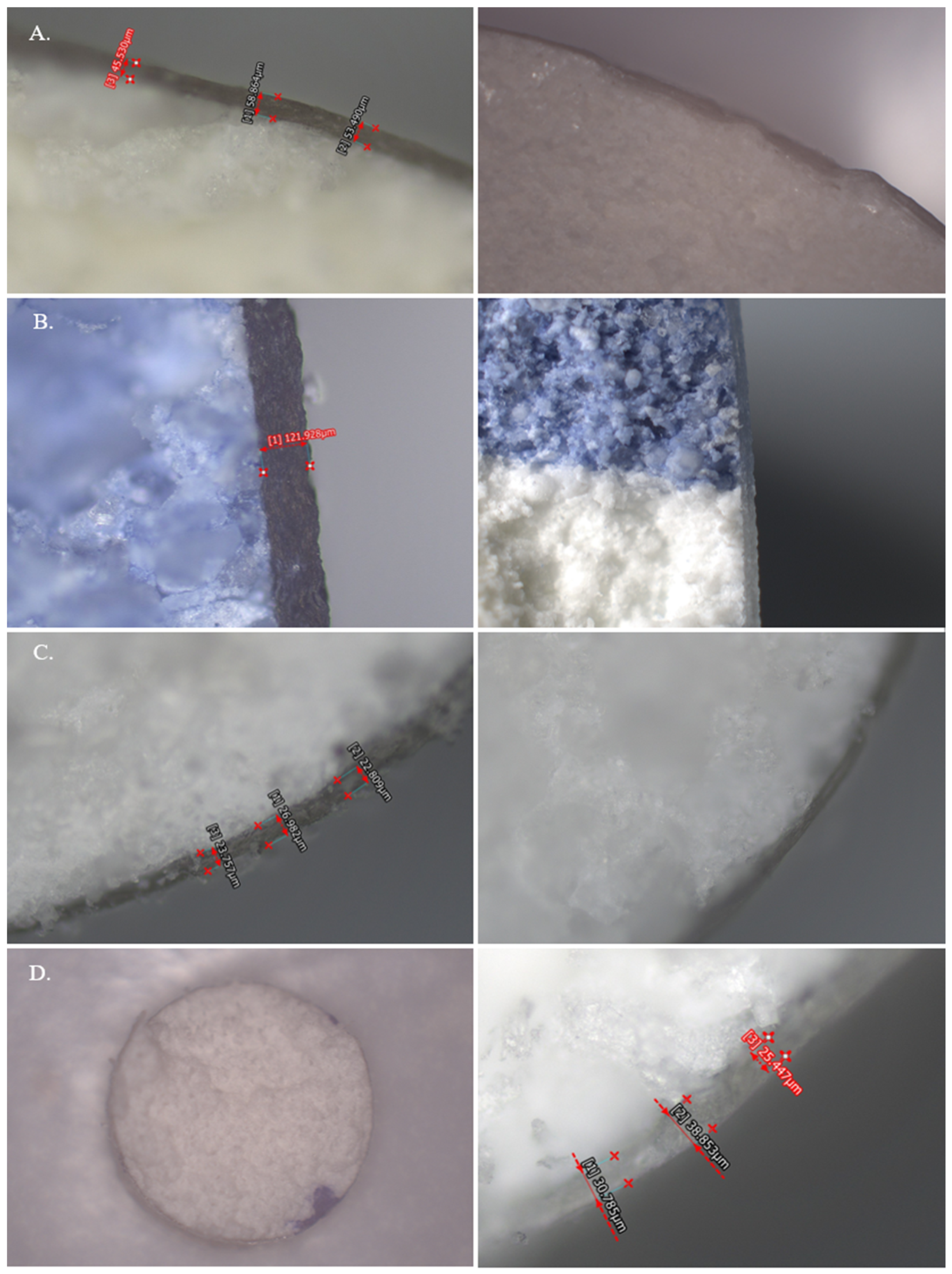 When comparing existing methods, such as SEM, which was not explicitly evaluated in this study, this technique commonly used for particle characterization yields high-resolution images that show the delineation between film coat and core tablet. However, SEM typically requires physical destruction of the tablet, similar to the Keyence method [
