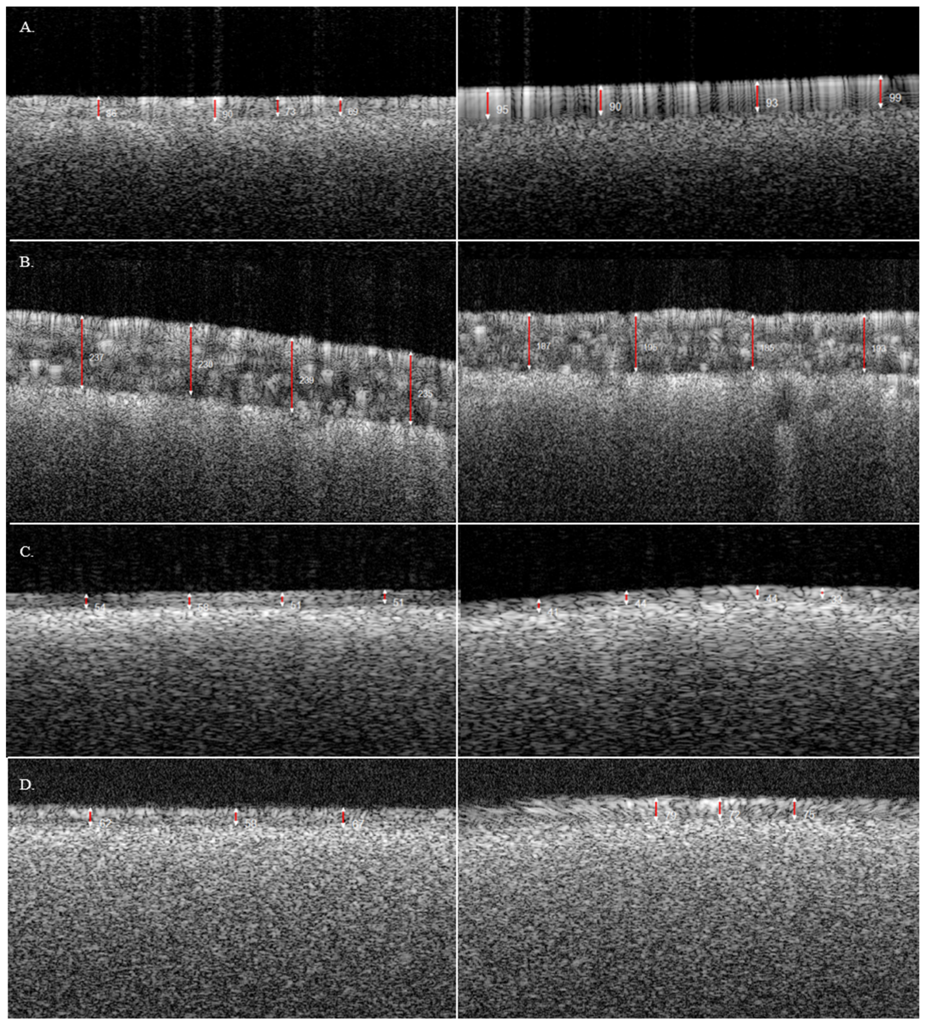 Figure 6B,C show a greater overlap of the Keyence and OSeeT OCT data than the Wasatch Spark OCT data, although the data still falls in different groupings. The