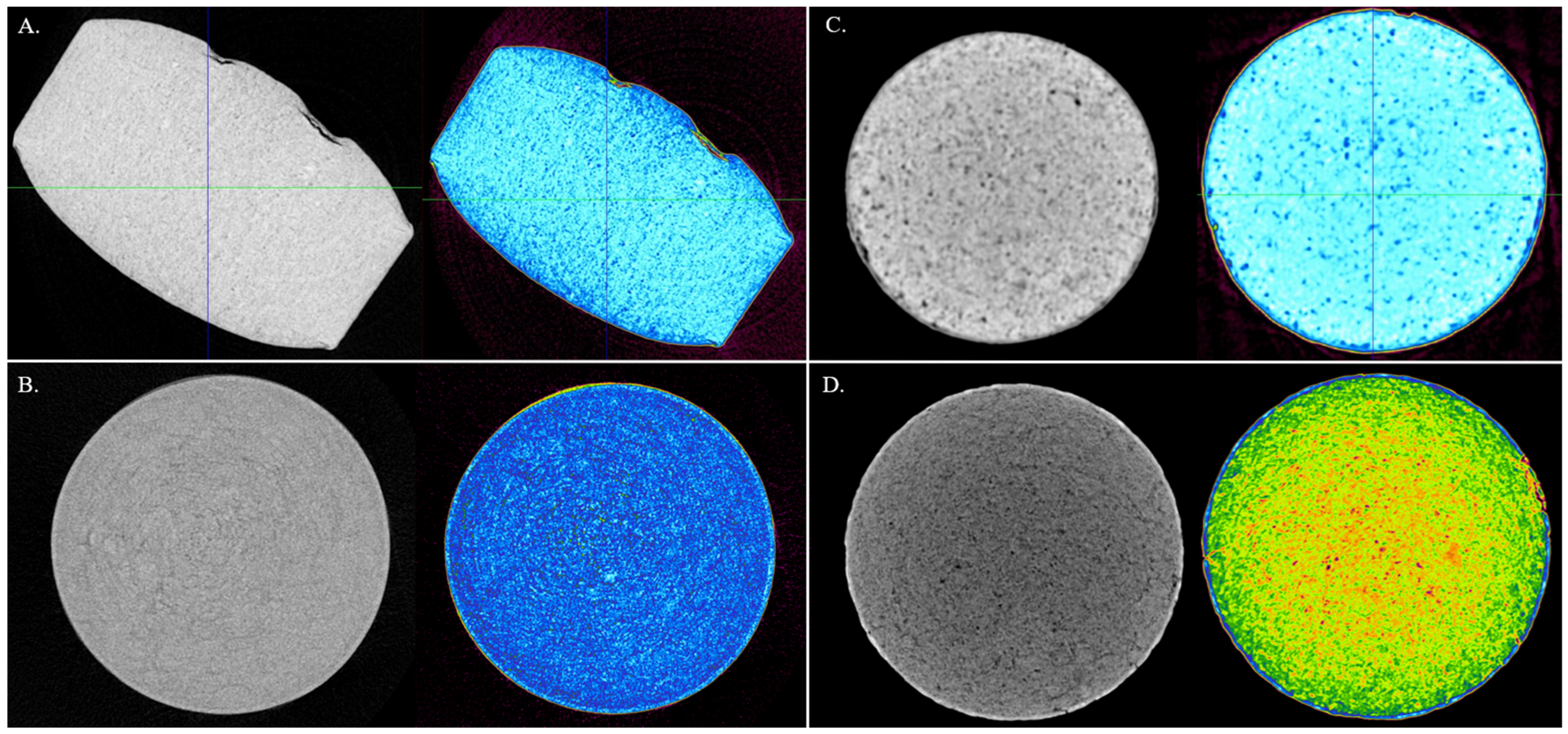 The final criterion to consider is the time to complete. At the development stage, the goal is to obtain a quick measurement to verify parameters and coating thickness as the measurements may need to be taken multiple times for multiple tablets. The Keyence and OCT only allow one tablet at a time to be measured and took approximately the same duration to complete. However, the OCT used in the second study had the capacity to measure multiple tablets at once, which based on the specific instrument can decrease the testing time. With normal XRCT use for internal defects, multiple tablets can be contained and measured in one scan, but due to the need to bring the tablet as close to the source as possible, only one tablet could be scanned at a time. With the set scanning parameters, each scan took approximately two hours to complete and an additional 15 min for reconstruction. Although time-consuming in comparison to the Keyence and OCT, especially for larger sample sizes, the same scans can also be used to evaluate internal defects as mentioned in the adaptability considerations. Despite this, compared to the brief time needed for OCT and Keyence measurements, the XRCT received the lowest score.