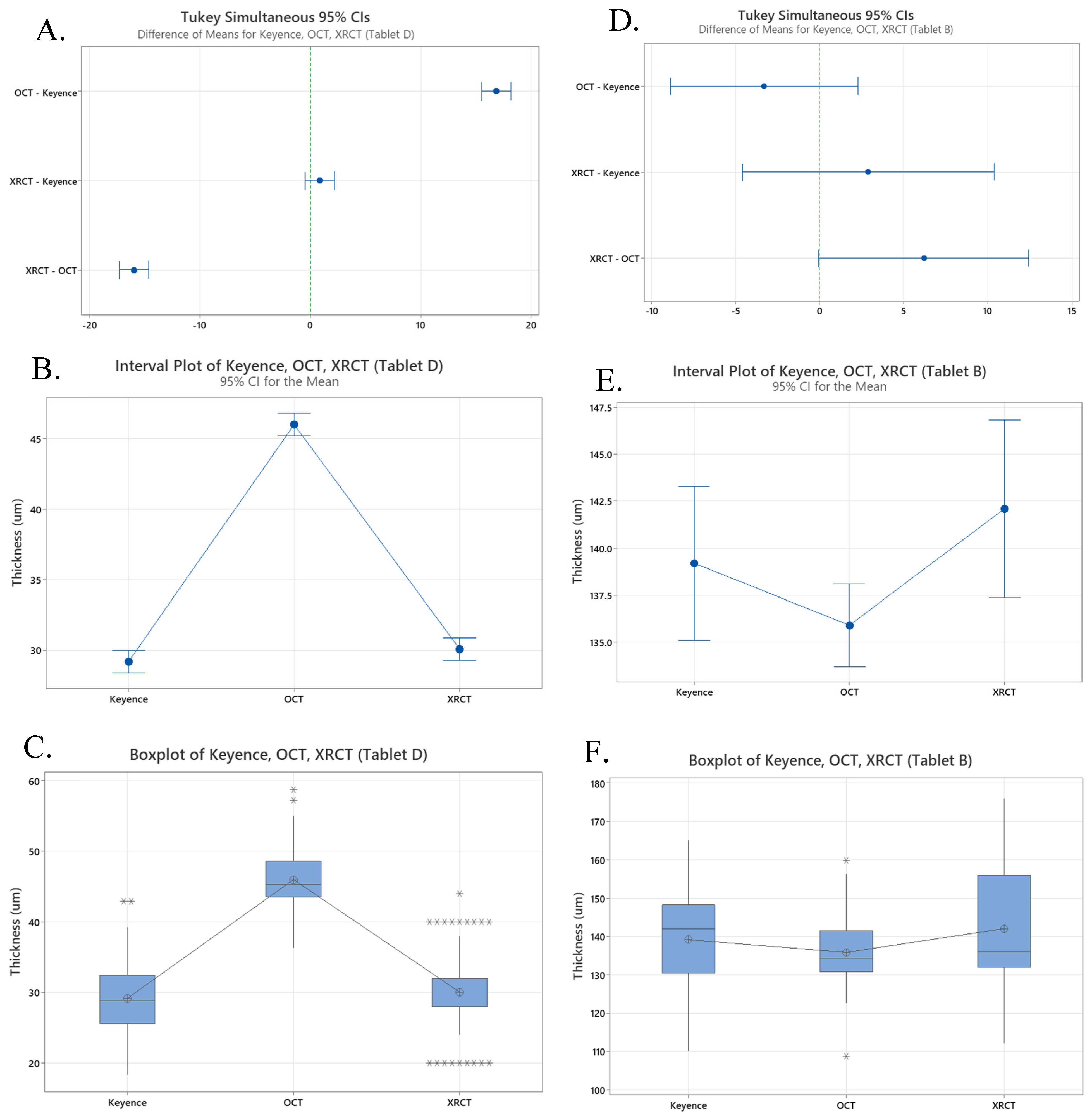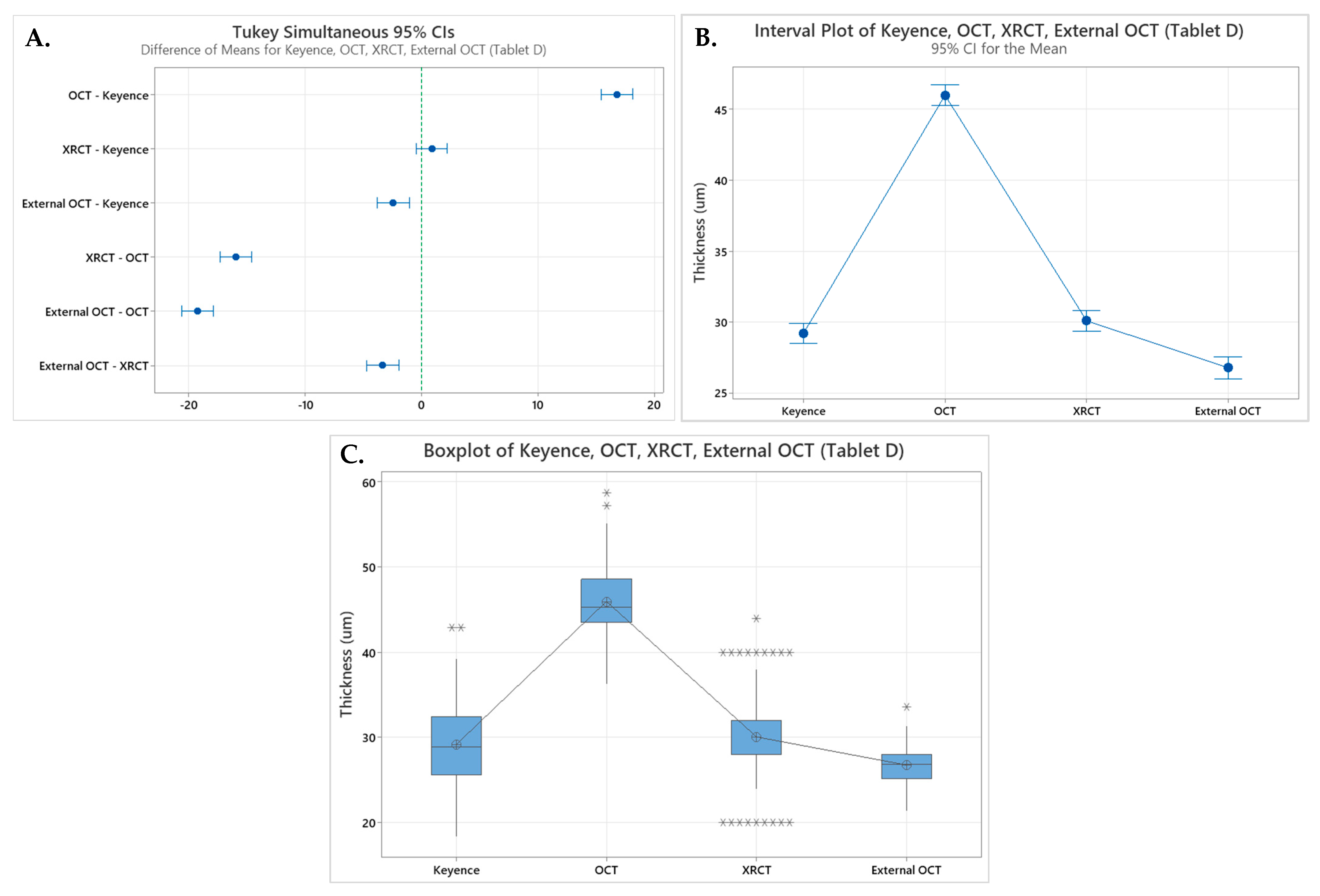An ANOVA test was performed comparing all three methods for Tablet B and D which yielded a p-value of 0.043 and 0.0, respectively, both of which are less than the designated alpha value of 0.05, indicating that there is evidence to reject the null hypothesis that all three instruments provide the same measurement. However, this rejection is expected considering the X-factor adjustments needed for the OCT. When looking at the OCT, used in the primary study, and XRCT individually compared to the Keyence measurement data, the OCT provides precise, but inaccurate data, whereas the XRCT provides accurate but imprecise data.