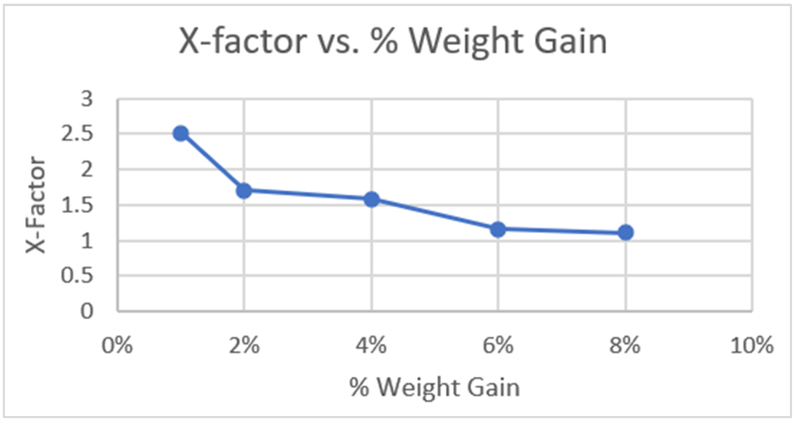 Figure 7, where thickness is presented as percent weight gain. These values were obtained from an additional experiment measuring Tablet A coated at increasing thickness and examined using the Wasatch Spark OCT. This is further supported by the accurate OCT measurements of Tablet B, which had the thickest film coat and showed the smallest difference from the reference value, with only a 2.4% difference. As a result, a set X-factor value could not be determined, and further testing is needed to generate a model that is representative of the necessary adjustment factor.