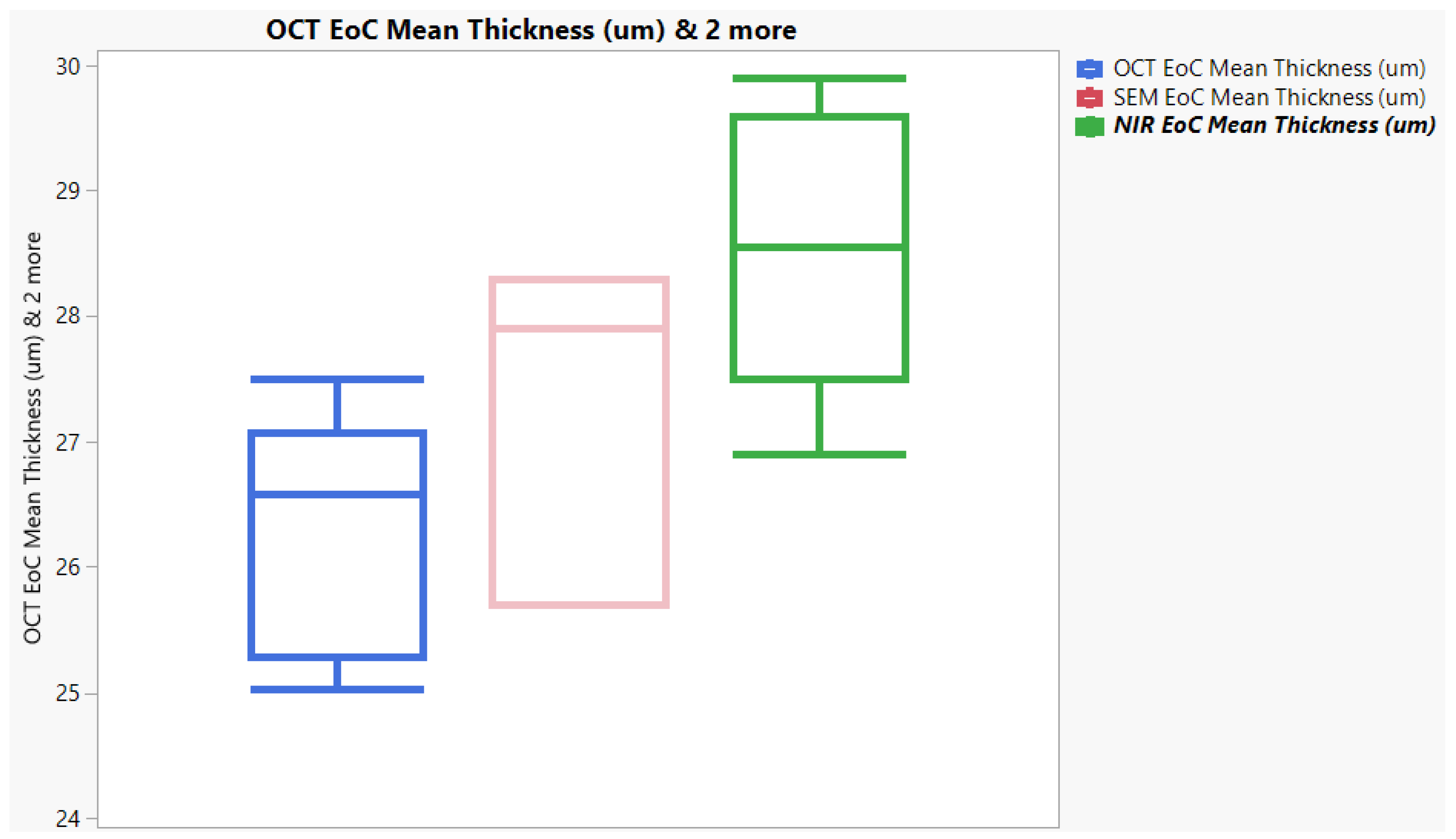 p-value of 0.035 which is less than α = 0.05, indicating a statistically significant difference. However, this is expected as the second OCT study utilized Tablet D samples from a different batch than the Keyence. The OSeeT OCT study provides closer data to the Keyence and provides more support for the OCT as an acceptable method of accurately measuring tablet film thickness. Additionally, the data obtained from the OSeeT was compared to SEM and NIR which are qualified methods utilized by the team that performed the second OCT study (