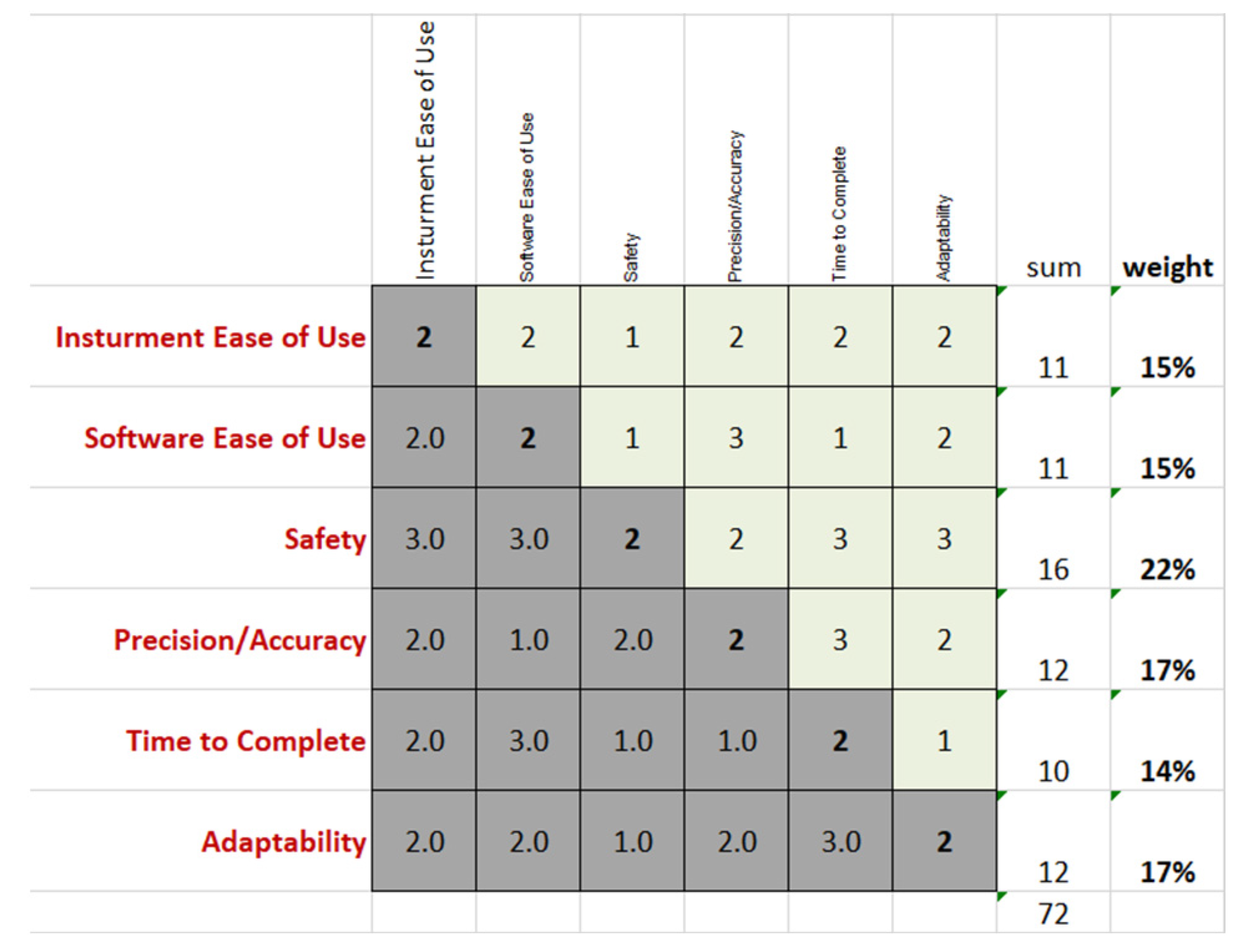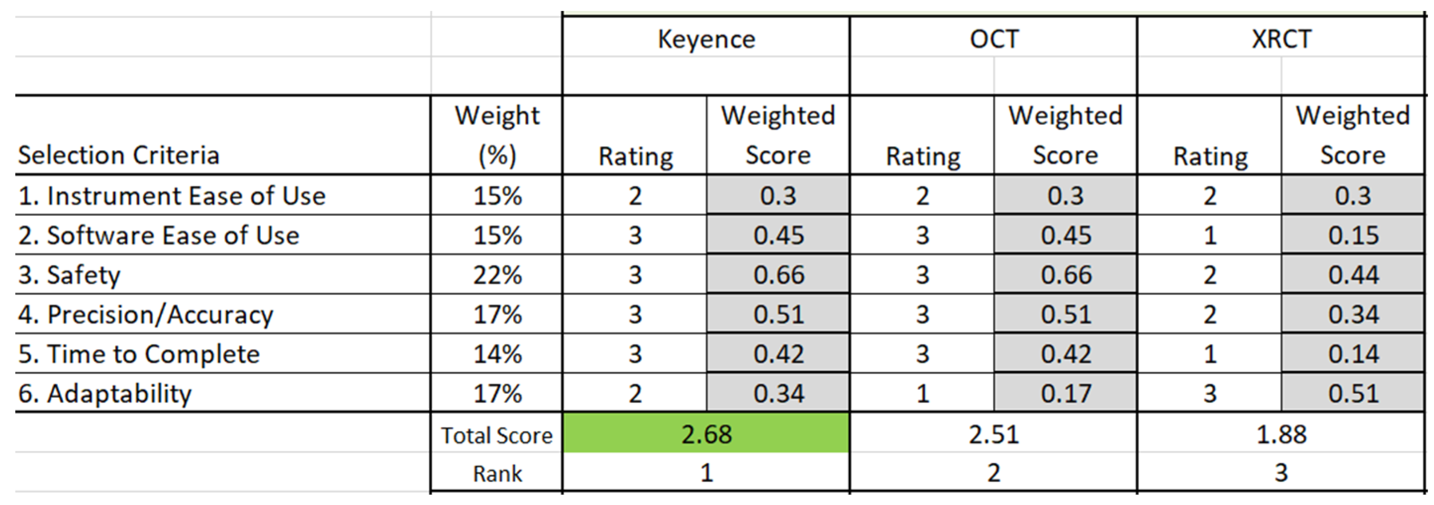 While precision and accuracy are fundamental criteria for evaluating the efficacy of measurement methods, additional factors must be considered when selecting an instrument for film coat thickness measurement during the development stage. These factors include, but are not limited to, ease of use, safety, and adaptability. An Analytical Hierarchy Process was employed to determine the relative importance of the selected criteria. Each criterion was systematically compared to the others to establish weighting factors that were subsequently incorporated into a Pugh Matrix, which was used to evaluate and compare the performance of the three measurement methods. The Pugh Matrix utilized a scoring scale ranging from 1 to 3, where 1 indicates the lowest performance and 3 the highest, for each criterion. This structured approach enabled a comprehensive comparison of the OCT and XRCT methods relative to the Keyence Microscope. The complete Analytical Hierarchy Process and Pugh Matrix can be found in