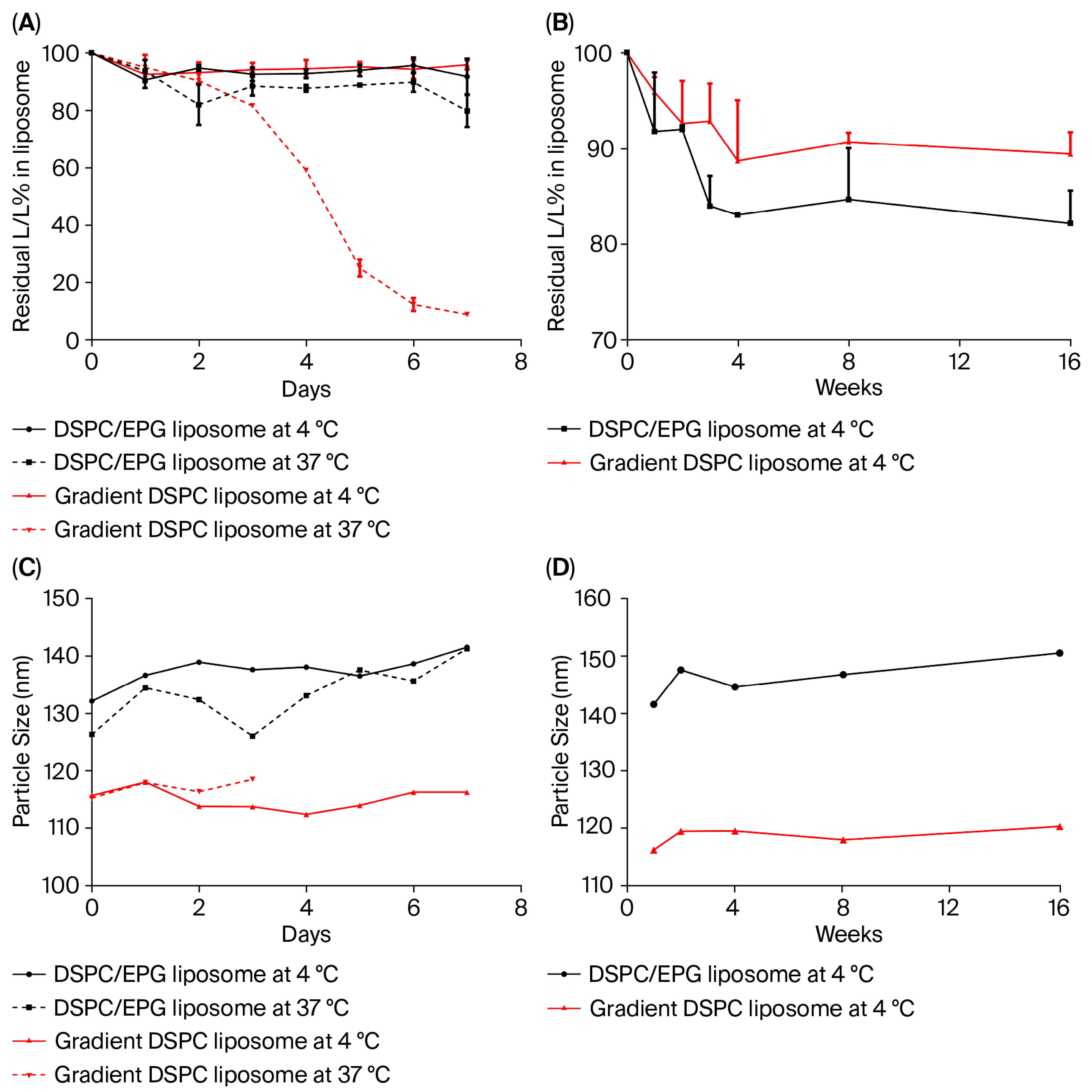 Gradient DSPC liposome | 10:0:5:0.2 | 0.5 | 98.70 ± 0.65 | 111.4 ± 1.5 | 0.071 ± 0.043 | 84.45 ± 3.18 | 0.074 ± 0.001 |