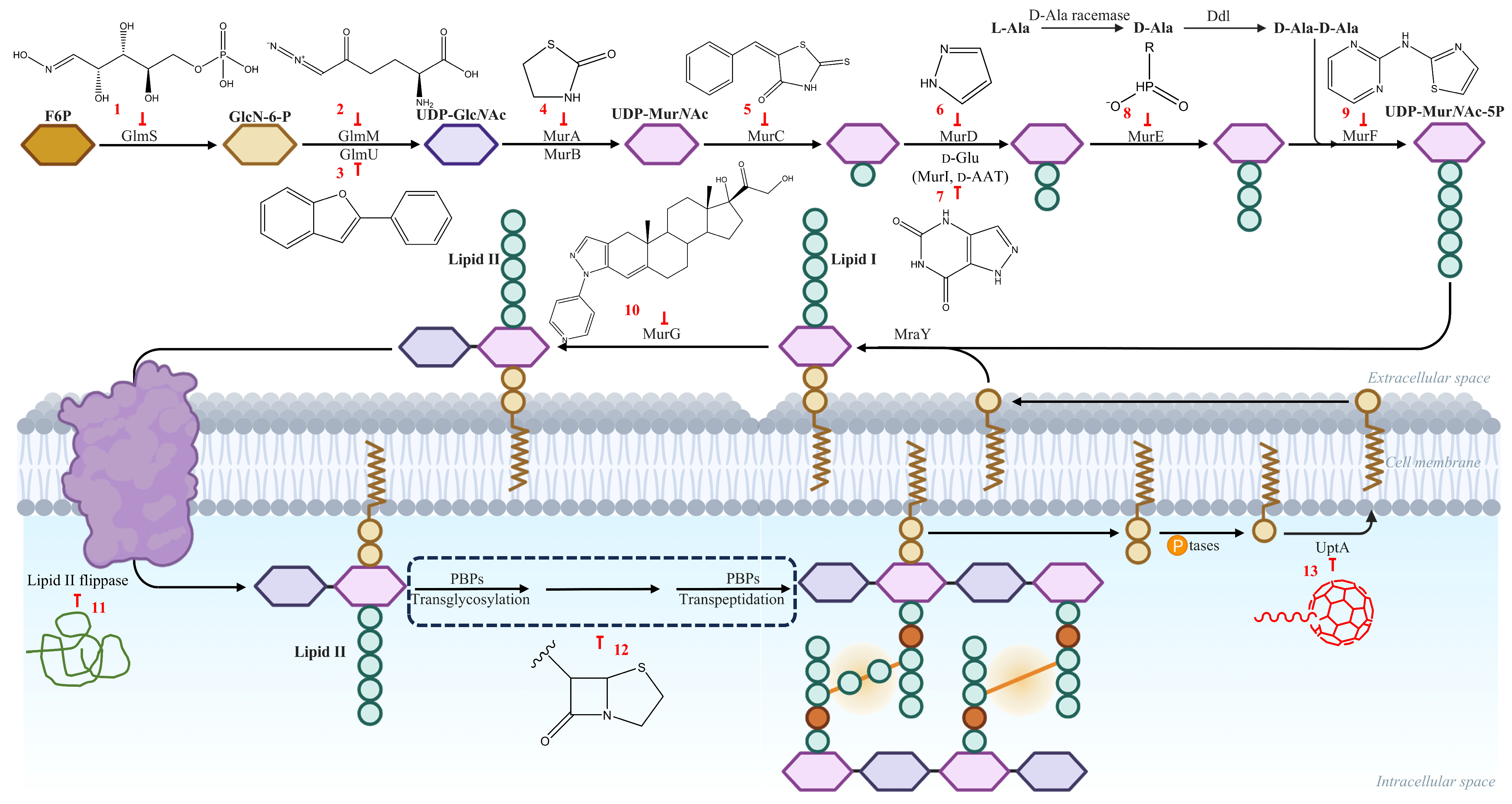 | MurA | Enolpyruvyl transfer to UDP-GlcNAc | Cytoplasmic | 1UAE, 3KR6, 3KQJ, 1EJC, 3VCY, 5VM7 | Fosfomycin, Avenaciolide, quinazolinone-based derivatives |
