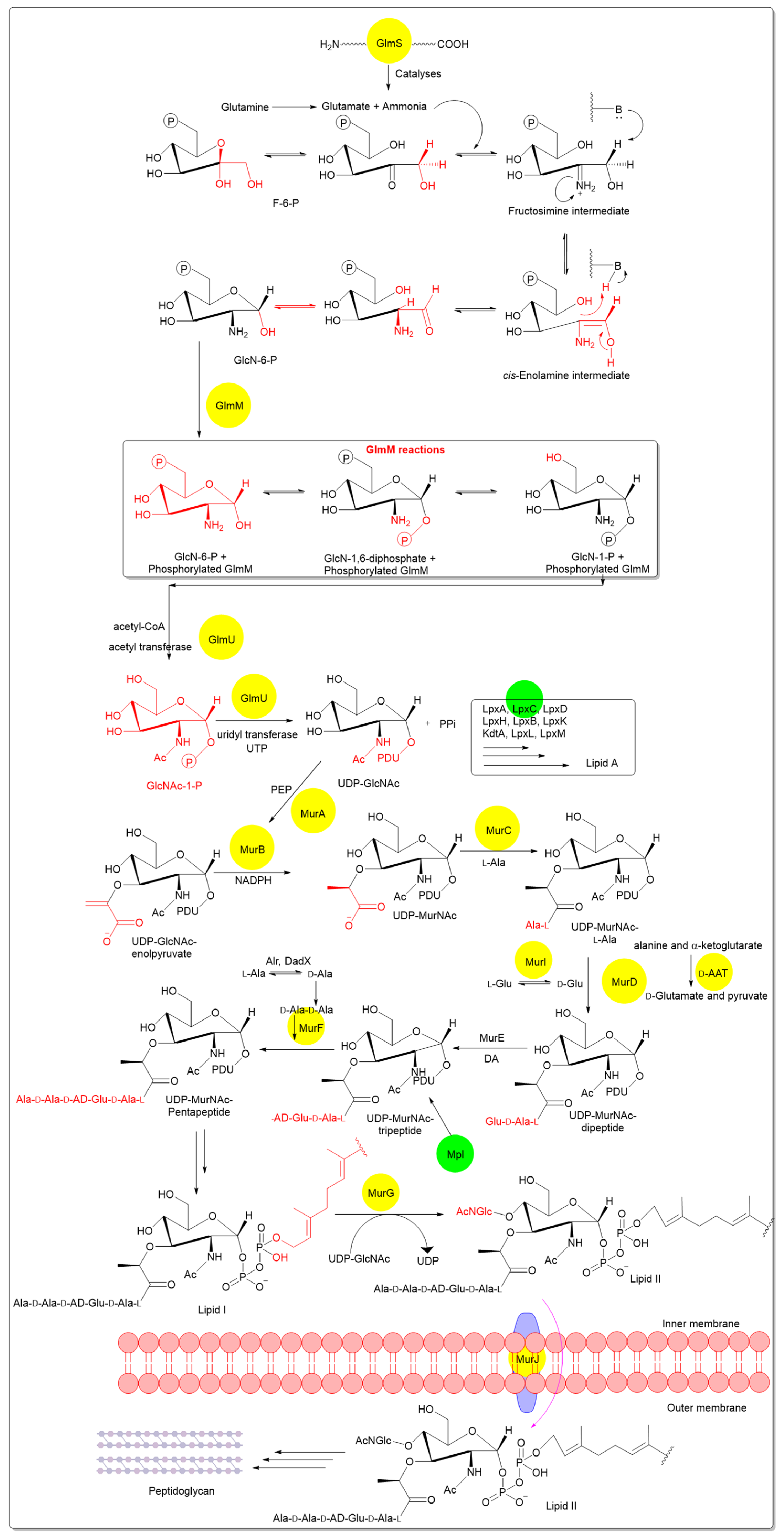 | GlmS | Fructose-6-P → Glucosamine-6-P | Cytoplasmic | 1MOQ, 1JXA, 2VF5, 4AMV | 6-chloro-5-oxo-l-norleucine, N-iodoacetylglucosamine-6-phosphate, 2-amino-2-deoxy-d-glucitol 6-phosphate |
