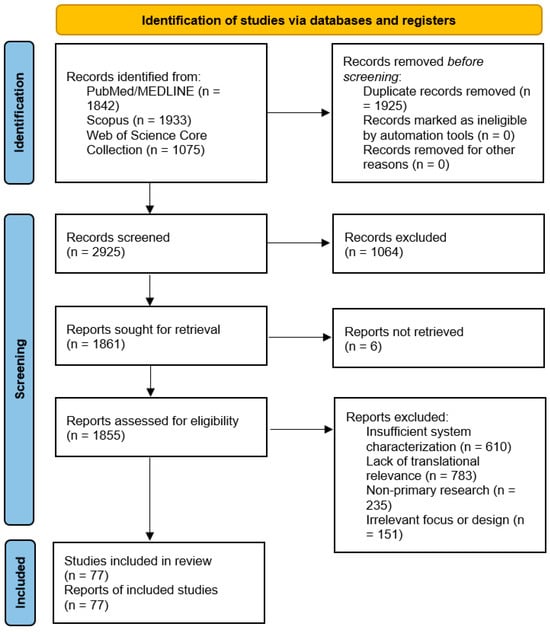 A systematic search of three electronic databases (PubMed/MEDLINE, Scopus, and Web of Science Core Collection) conducted up to 15 April 2025 initially yielded 4850 records (Figure 1). After removal of 1925 duplicates, 2925 unique records underwent title-abstract screening.