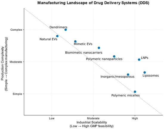 Liposomes and LNPs represent the most clinically advanced platforms. Liposomes benefit from these manufacturing innovations [8] and surface modifications such as pegylation [9] for optimized chemotherapeutic delivery. LNPs enable mRNA vaccines [10,11] and siRNA therapies [12], while polymeric systems including PLGA-based nanoparticles provide controlled release and combination delivery [13].