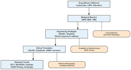 Background/Objectives: Advanced drug delivery systems (DDSs) are essential for targeted delivery, controlled release, and reduced systemic toxicity, but their clinical adoption is limited by biological barriers, manufacturing complexities, and cost. The aim of this systematic review is to critically evaluate the quantitative relationships between platform design, overcoming biological barriers, and clinical translation outcomes for DDS developed between 2016 and 2025. Methods: A comprehensive literature search was conducted in PubMed/MEDLINE, Scopus, and Web of Science (January 2016–April 2025) in accordance with the PRISMA 2020 guidelines. Included studies focused on experimental or clinical data for nanocarrier platforms (liposomes, lipid nanoparticles, polymer systems, biomimetic carriers, extracellular vesicles). Data on platform characteristics, interactions with barriers, pharmacokinetics, manufacturing, and clinical outcomes were extracted and synthesized in narrative form due to the significant methodological heterogeneity. Results: An analysis of 77 included studies confirms that successful clinical translation depends on matching the physicochemical properties of the carrier (size, surface chemistry, material) to specific biological barriers. Liposomes and lipid nanoparticles (LNPs) remain the most clinically validated platforms, exploiting the EPR effect and liver tropism, respectively. Key engineering solutions include stealth coatings, ligand-mediated targeting, and stimulus-responsive materials to overcome barriers such as mononuclear phagocyte system clearance, the blood–brain barrier, and mucosal barriers. Microfluidic and continuous manufacturing processes enable reproducibility, but scalability, cost, and immunogenicity (e.g., anti-PEG responses) remain key translational challenges. Engineered extracellular vesicles, biomimetic carriers, and 3D/4D-printed systems combined with AI-driven design demonstrate the potential for personalized, adaptive delivery. Conclusions: Cutting-edge DDSs have validated their clinical value, but realizing their full potential requires a holistic, patient-centered design approach integrating barrier-specific engineering, scalable manufacturing, and rigorous safety assessment from the earliest stages of development. Further progress will depend on standardizing methods for new platforms (e.g., extracellular vesicles), implementing digital and AI tools, and ensuring translational feasibility as a fundamental principle.