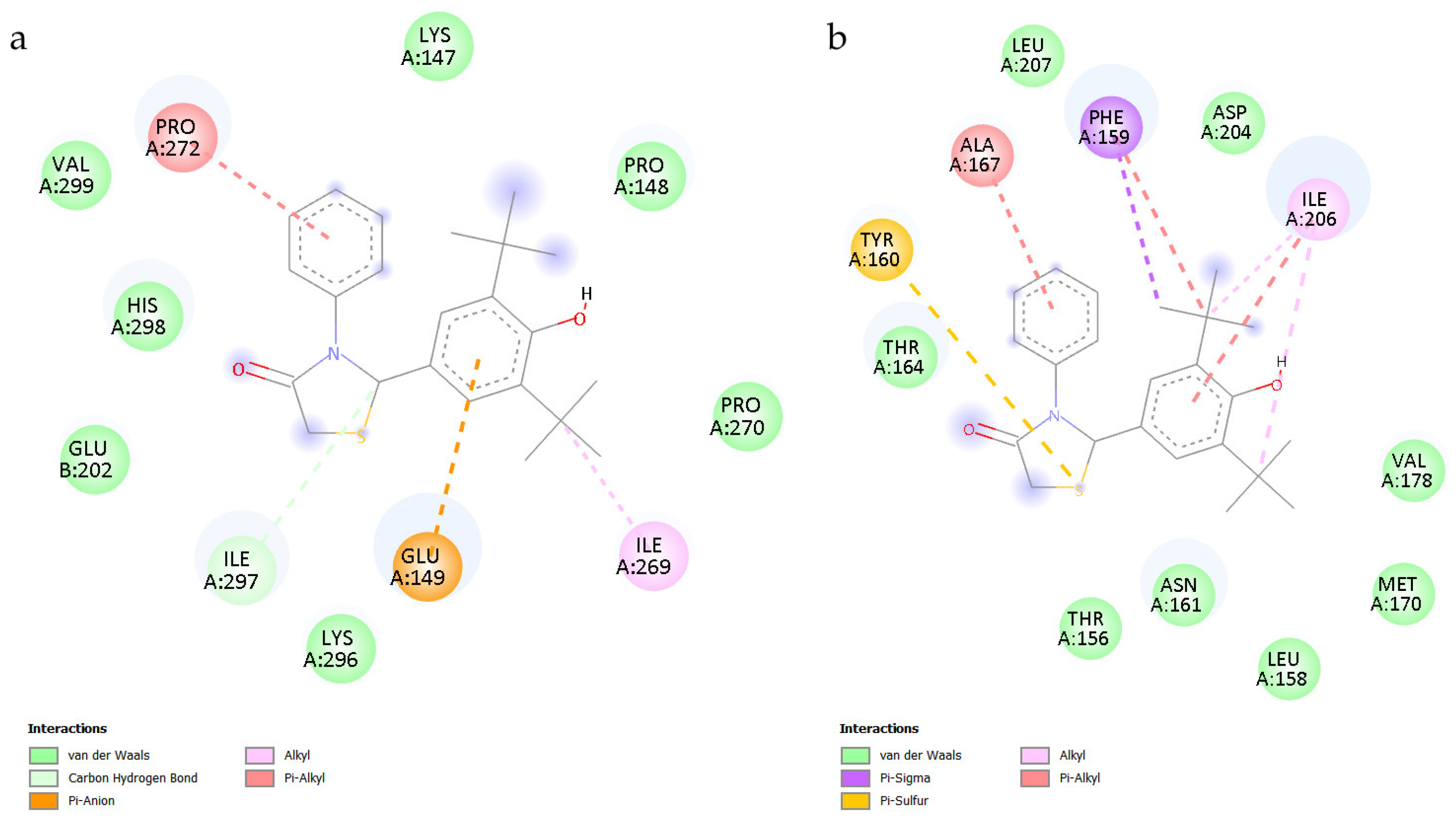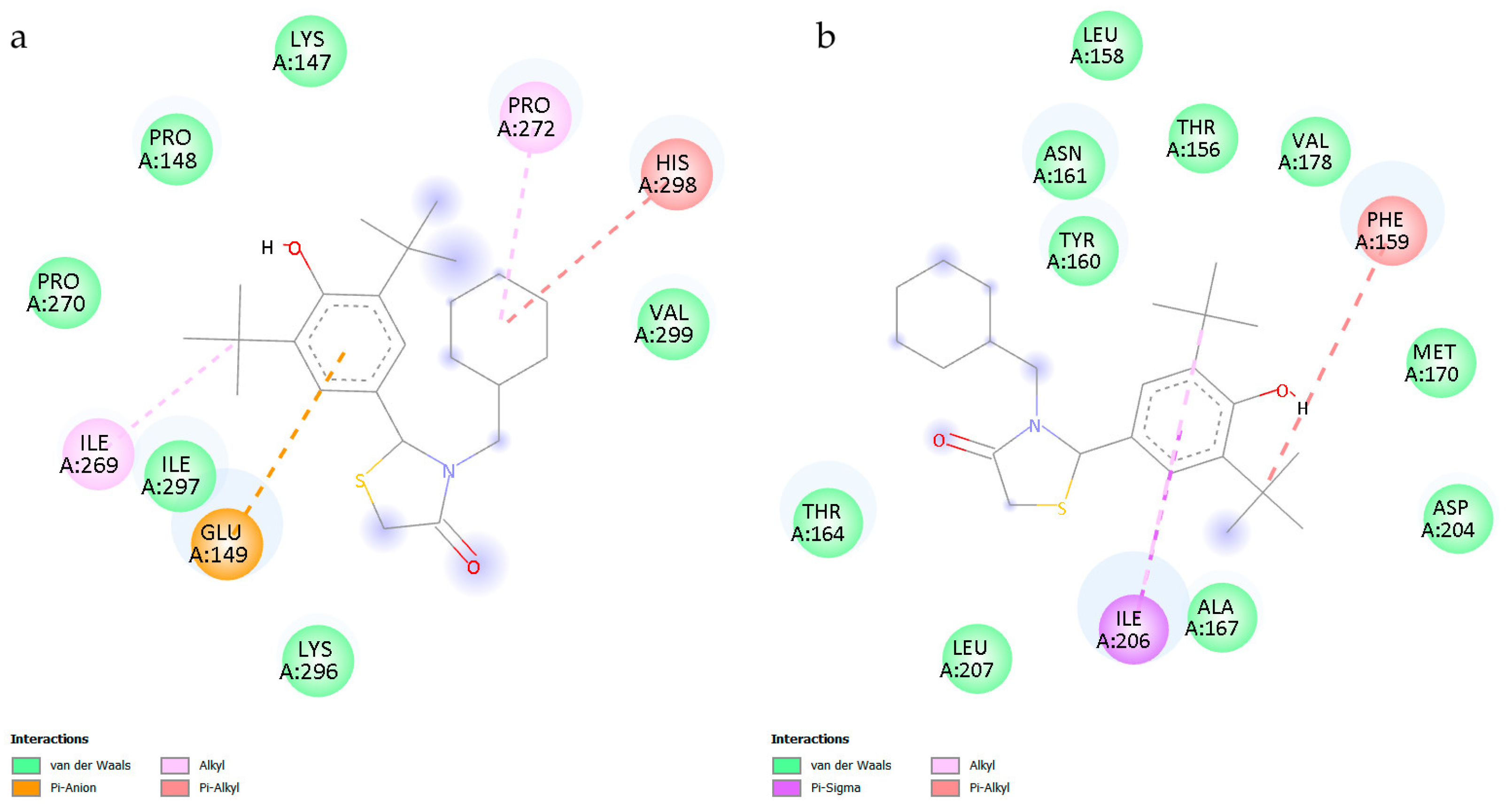 - Babu, B.A.; Divakar, S.; Gowramma, B.; Jupudi, S.; Chand, J.; Malakar Kumar, V. Rational design of thiazolidine-4-one-gallic acid hybrid derivatives as selective partial PPARγ modulators: An in-silico approach for type 2 diabetes treatment. J. Biomol. Struct. Dyn. 2025, 43, 694–708. [Google Scholar] [CrossRef]
