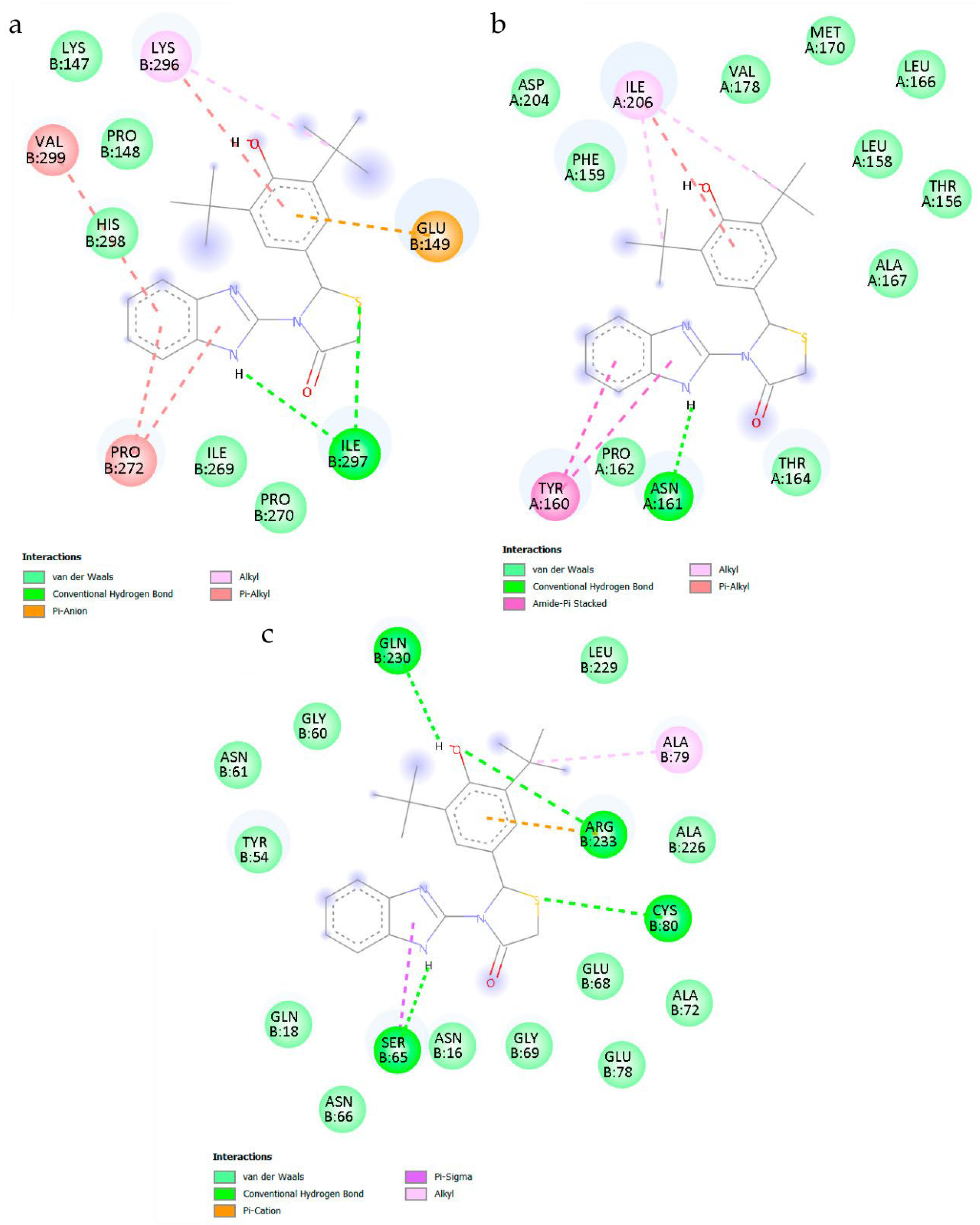 | 4c | CPC | 31 | −6.33 | −0.204 | Ala10, Trp14, Trp34, Lys38, Leu55 |
