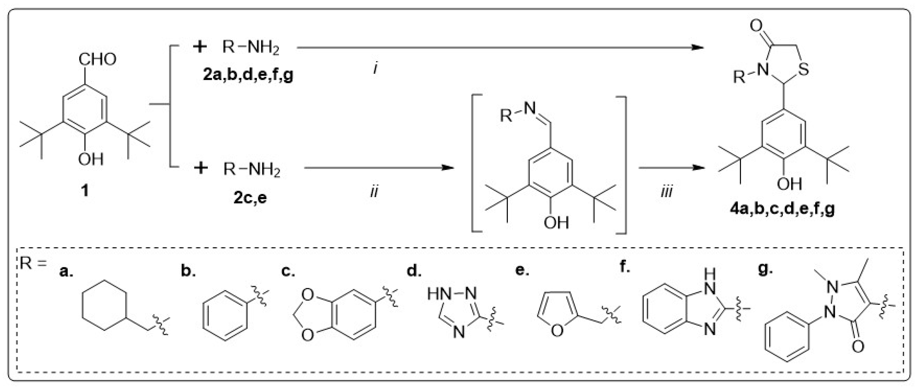 2.1.2. Synthesis of 2-(3,5-di-tert-butyl-4-hydroxyphenyl)-3-substituted-thiazolidin-4-ones (4)