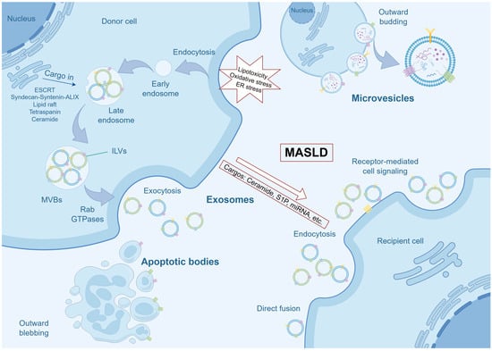 Importantly, in the pathological context of MASLD, characterized by lipotoxicity, oxidative stress, and endoplasmic reticulum (ER) stress, there is a notable increase in the secretion of EVs, accompanied by specific alterations in the sorting of their contents [39,40]. This indicates that pathogenic hepatocytes do not release EVs in a random manner; rather, they intentionally package pathogenic components such as ceramide, sphingosine-1-phosphate (S1P), and specific microRNAs (miRNAs) [11,41,42]. This pathological reprogramming underlies the transformation of EVs from mere cellular messengers to active promoters of disease, thereby facilitating subsequent intrahepatic and systemic pathological communication.