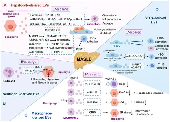 Moreover, EVs from steatotic hepatocytes have been demonstrated to provoke pro-fibrotic responses in cultured stellate cells, indicating that EVs serve as operational communicators in the pathophysiology of MASLD-associated liver fibrosis [53]. One significant study highlights the role of β-arrestin1 in modulating the release of hepatocyte-derived EVs enriched with mannan-binding lectin serine protease 1 (MASP1). These EVs activate HSCs through the p38 MAPK/ATF2 signaling pathway, promoting liver fibrogenesis in experimental models. Notably, the translational significance of this pathway is highlighted by clinical observations, as evidenced by the markedly elevated expression of MASP1 in both serum and liver tissue of patients with liver fibrosis. This suggests a robust association between this extracellular vesicle-associated mediator and human fibrotic disease [54]. Similarly, lipotoxic hepatocyte-derived EVs containing LIM domain and actin binding 1 (LIMA1) or miR-27a crucially promote HSC activation by hindering mitophagy, vital for cellular balance and stress response. In the clinical context, these findings suggest that elevated levels of LIMA1 are present in both the serum and serum small EVs of patients with MASH when compared to healthy controls [55,56,57]. Further supporting this, another study identified that lipotoxic hepatocyte-derived exosomal miR-1297 promotes HSC activation through the PTEN/PI3K/AKT signaling pathway [58]. Other cargos derived from hepatocytes, such as miR-128-3p, iron, and ferritin, can also induce the activation of HSCs, leading to the deposition of extracellular matrix (ECM) components and fibrosis. Notably, EV-mediated transfer of iron and iron-related components gains clinical relevance given the well-established observation that hepatic iron homeostasis is impaired in human MASLD/MASH [59,60,61]. However, the regulation of HSCs by hepatocyte-derived exosomes is not limited to activation. The RNA-binding protein Pumilio1 (PUM1) has been shown to be enriched in hepatocyte-derived exosomes, where it inhibits HSC activation by suppressing tropomyosin-4 translation. Importantly, this potentially protective mechanism may be compromised in MASLD, as the expression of PUM1 has been observed to be decreased in both patient samples and experimental models of the disease. This suggests that the loss of a regulatory EV cargo could contribute to the progression of hepatic fibrosis [62]. These conflicting findings, such as the dual roles of hepatocyte-derived EVs, indicate that their functions are context-dependent and warrant further investigation. By understanding the specific pathways and mechanisms through which these EVs influence HSC activation, novel therapeutic strategies can be developed to mitigate liver fibrosis and improve outcomes for patients with MASLD.