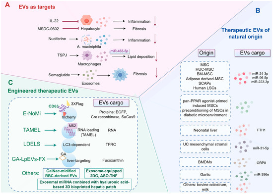 Schematic overview of the therapeutic landscape of EVs in MASLD. (A) EVs as therapeutic targets. Several pharmacological agents, such as IL-22, Semaglutide, and Nuciferine, achieve their therapeutic effects by modulating EV pathways. This modulation results in improvements in key pathological features of MASLD, including inflammation, fibrosis, and lipid deposition. (B) Therapeutic EVs of natural origin. A diverse array of native EVs, derived from various cellular sources such as stem cells from different tissues, liver cells, macrophages, and dietary sources, exhibit intrinsic therapeutic properties for the treatment of MASLD. (C) Strategies to enhance EV efficacy through engineering. BMDMs, bone marrow-derived macrophages; BM-MSC, bone marrow-derived mesenchymal stem cell; 2DG, 2-deoxy-D-glucose; EVs, extracellular vesicles; FTH1, ferritin heavy chain 1; GalNac, N-acetyl galactosamine; HUC, human umbilical cord; IL-22, interleukin-22; LDELS, LC3-dependent EV loading and secretion; LSCs, liver stem cells; MSCs, mesenchymal stem cells; ORP8, oxysterol-binding protein-related protein 8; RBC, red blood cell; SCAPs, stem cells of the apical papilla; TAMEL, Targeted and Modular EV Loading; TFRC, transferrin receptor; TNF, tumor necrosis factor; TSPJ, total saponins from Panax japonicus.