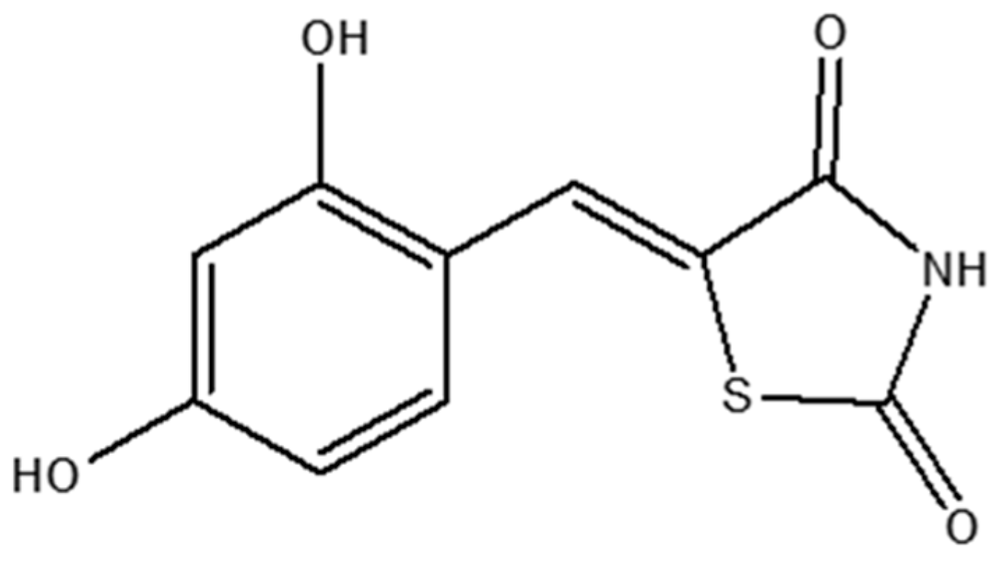- Kim, S.H.; Choi, Y.J.; Moon, K.M.; Lee, H.J.; Woo, Y.; Chung, K.W.; Jung, Y.; Kim, S.; Chun, P.; Byun, Y.; et al. The inhibitory effect of a synthetic compound, (Z)-5-(2,4-dihydroxybenzylidene) thiazolidine-2,4-dione (MHY498), on nitric oxide-induced melanogenesis. Bioorg. Med. Chem. Lett. 2013, 23, 4332–4335. [Google Scholar] [CrossRef]