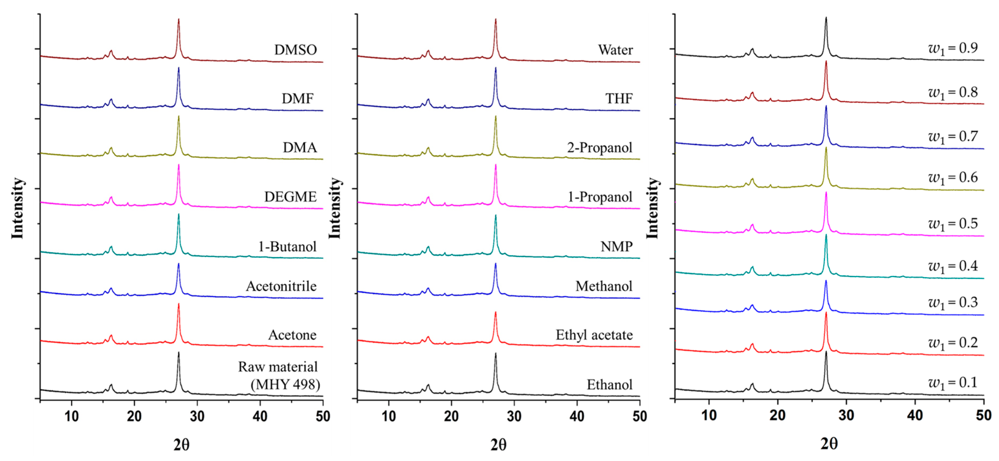 - Lee, S.-K.; Sim, W.-Y.; Ha, E.-S.; Park, H.; Kim, J.-S.; Jeong, J.-S.; Kim, M.-S. Solubility of bisacodyl in fourteen mono solvents and N-methyl-2-pyrrolidone + water mixed solvents at different temperatures, and its application for nanosuspension formation using liquid antisolvent precipitation. J. Mol. Liq. 2020, 310, 113264. [Google Scholar] [CrossRef]