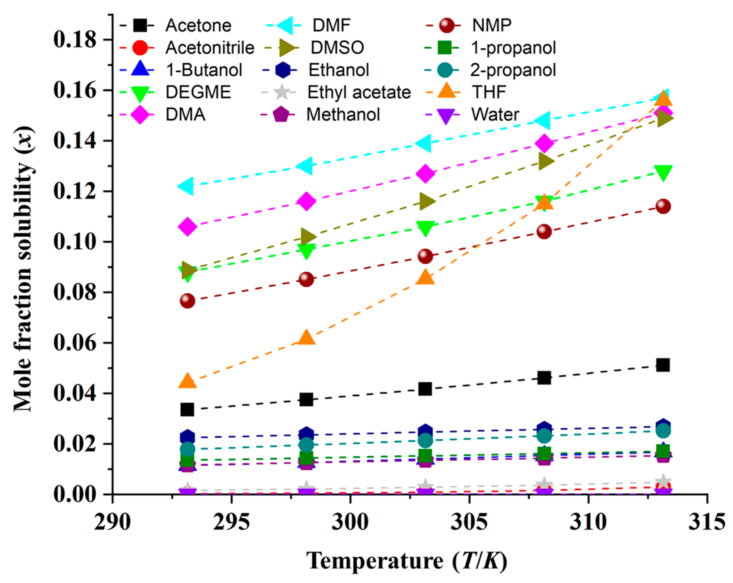 - Miao, H.; Zhang, H.; Zhang, X.; Liu, M.; Zhou, M.; Liu, Y. Solubility measurement and correlation of niflumic acid in fourteen single solvents from 288.15 K to 328.15 K. J. Mol. Liq. 2025, 437, 128413. [Google Scholar] [CrossRef]
