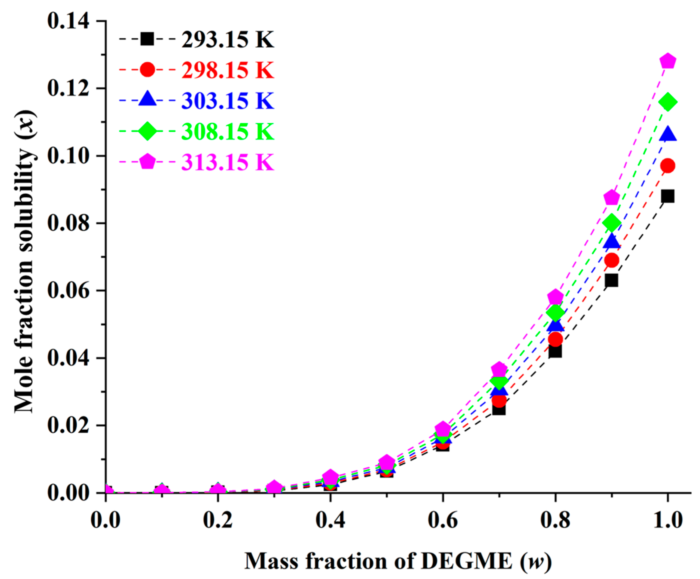 3.2.2. MHY498 Solubility in (DEGME + Water) Mixed Solvents