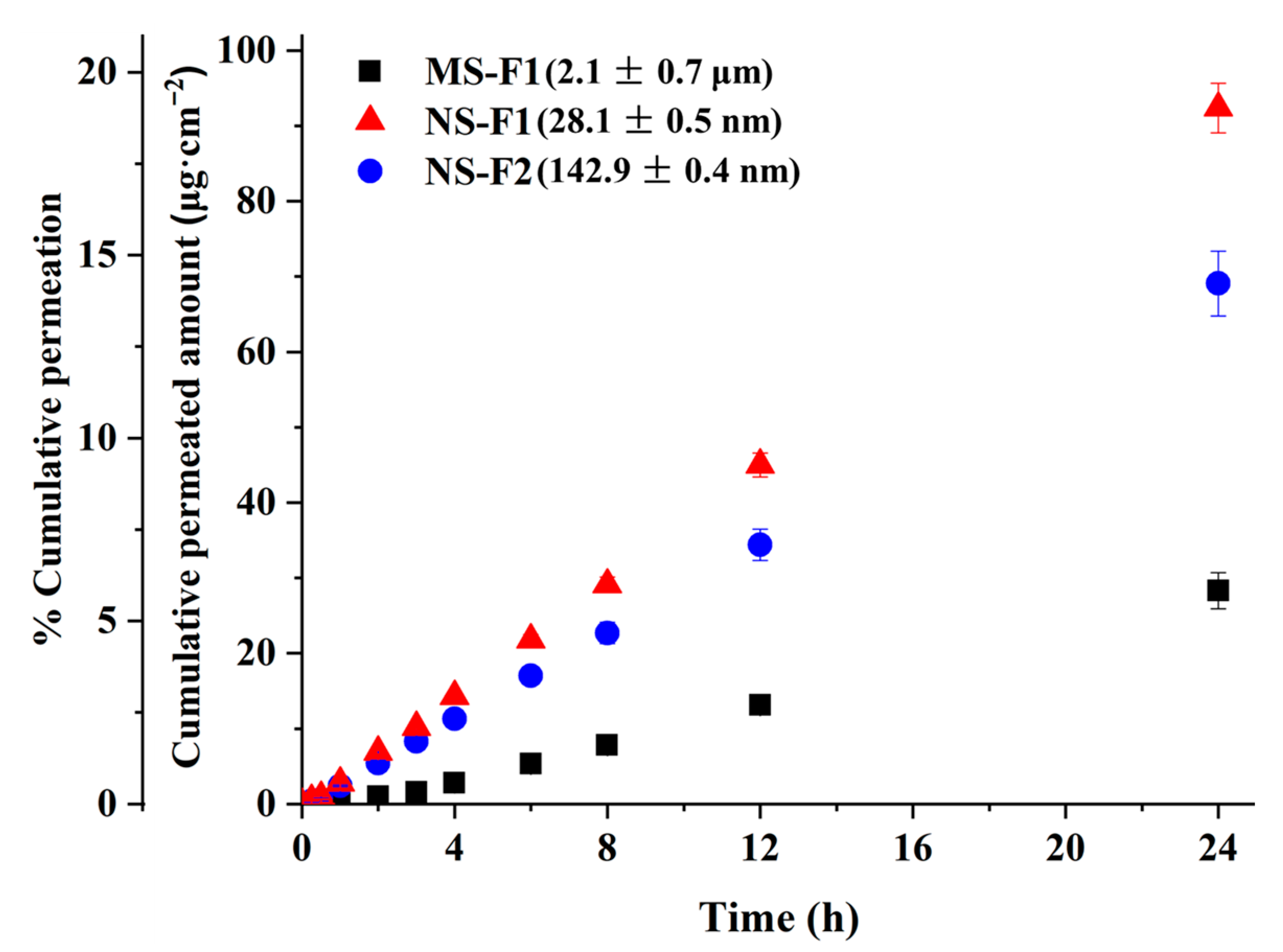 - Yao, S.; Chen, N.; Sun, X.; Wang, Q.; Li, M.; Chen, Y. Size-dependence of the skin penetration of andrographolide nanosuspensions: In vitro release-ex vivo permeation correlation and visualization of the delivery pathway. Int. J. Pharm. 2023, 641, 123065. [Google Scholar] [CrossRef]