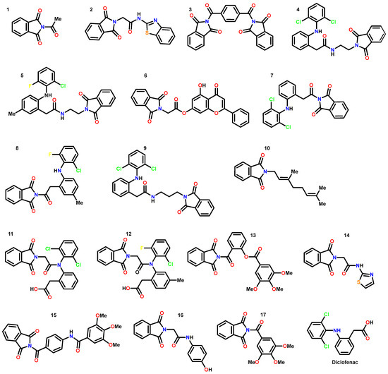 - Alanazi, A.M.; El-Azab, A.S.; Al-Suwaidan, I.A.; Eltahir, K.E.H.; Asiri, Y.A.; Abdel-Aziz, N.I.; Abdel-Aziz, A.A.M. Structure-Based Design of Phthalimide Derivatives as Potential Cyclooxygenase-2 (COX-2) Inhibitors: Anti-Inflammatory and Analgesic Activities. Eur. J. Med. Chem. 2015, 92, 115–123. [Google Scholar] [CrossRef]