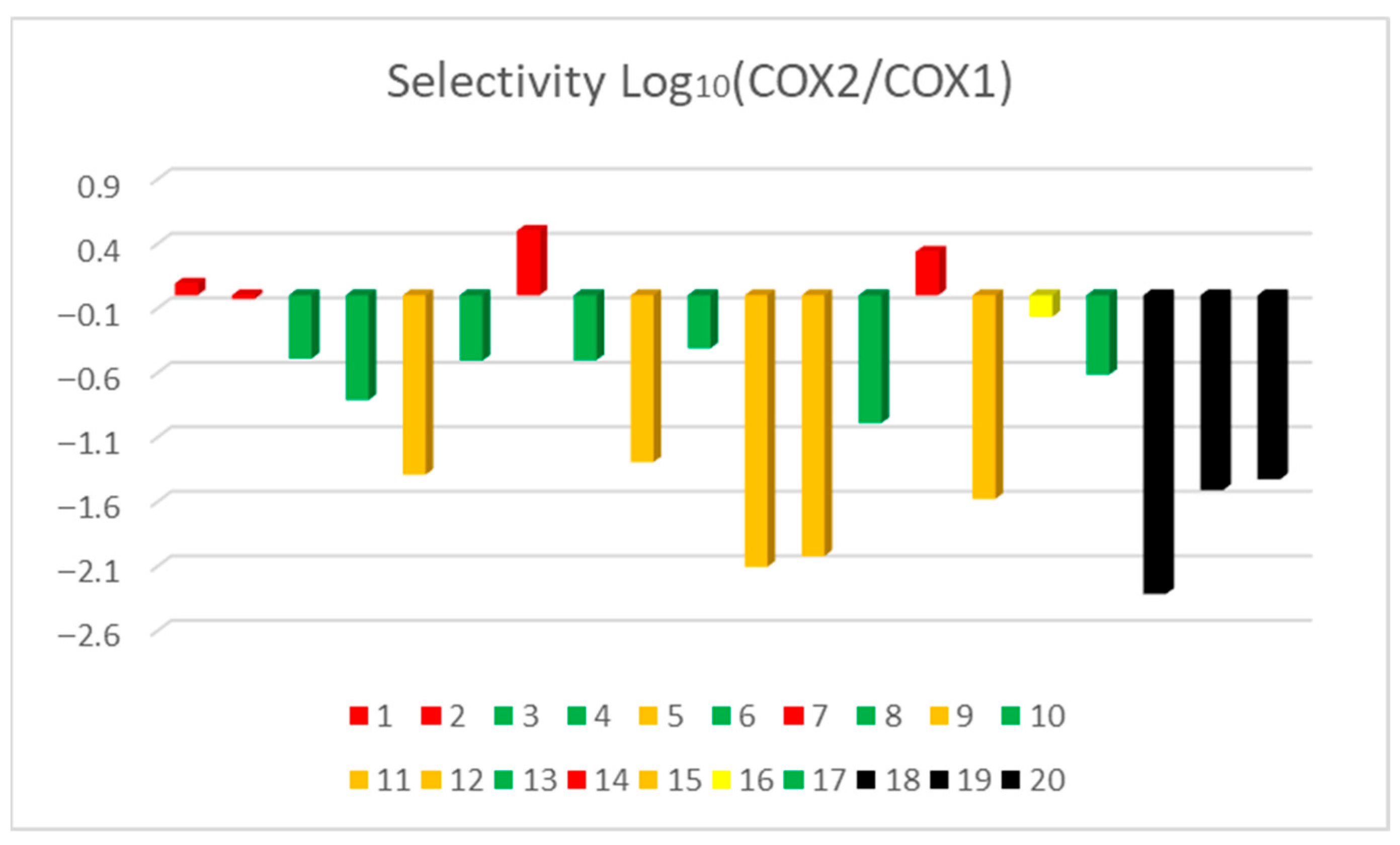 | Compound | Ki COX-1 | Ki COX-2 | Log10(Ki COX-2/Ki COX-1) | Compound | Ki COX-1 | Ki COX-2 | Log10(Ki COX-2/Ki COX-1) |
