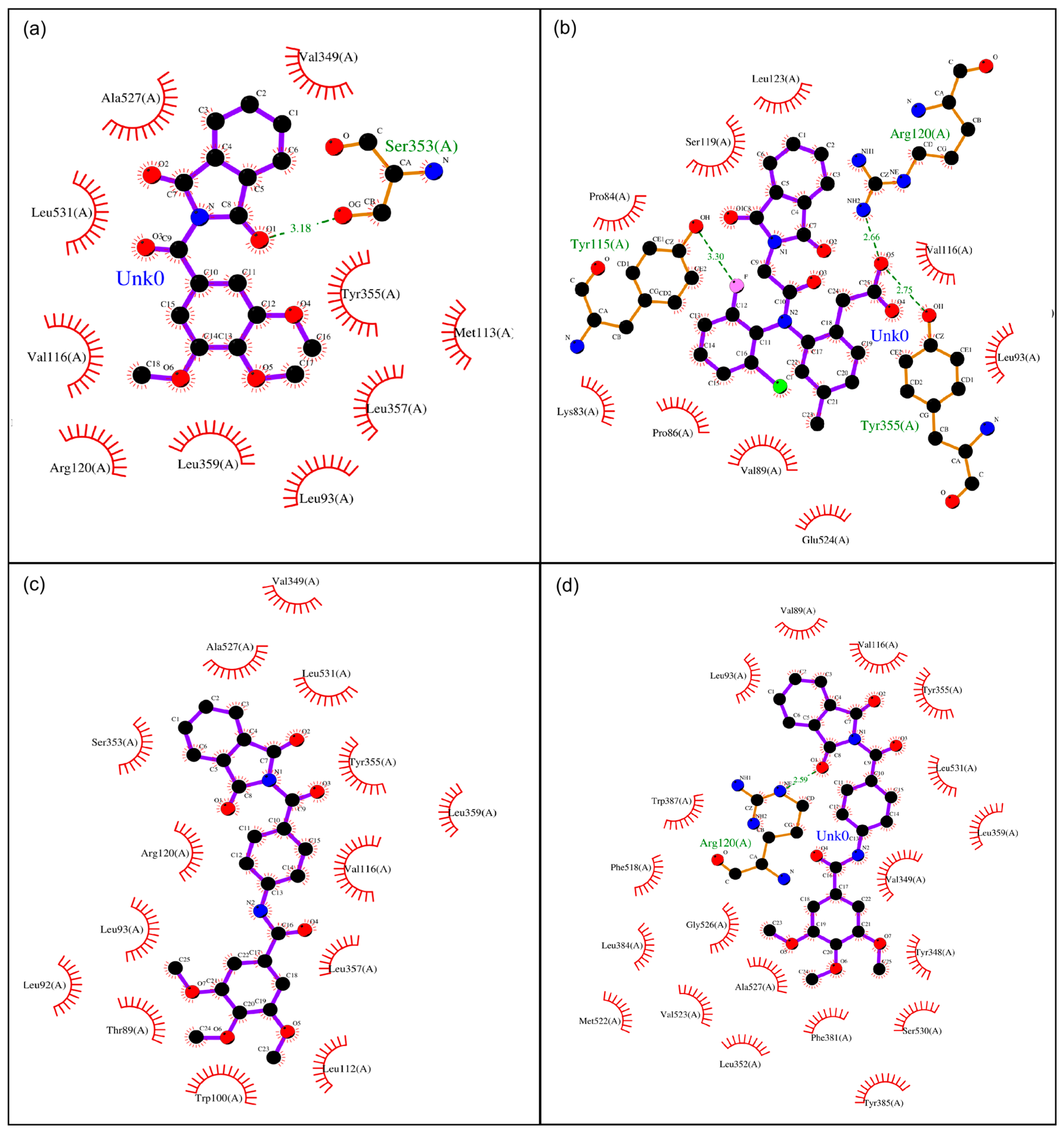 | 6 | −9.68 | −10.38 | VAL116, LEU359, LEU357, TYR355, LEU93, SER353, LEU352, ARG120 *, VAL349, ALA527, ILE523, PHE518, GLY526, TRP387, LEU384, TYR385, SER530, LEU351 | ILE112, LEU93, VAL116, TYR355, ARG120 *, SER353, LEU351, ALA527, VAL523, LEU352 |