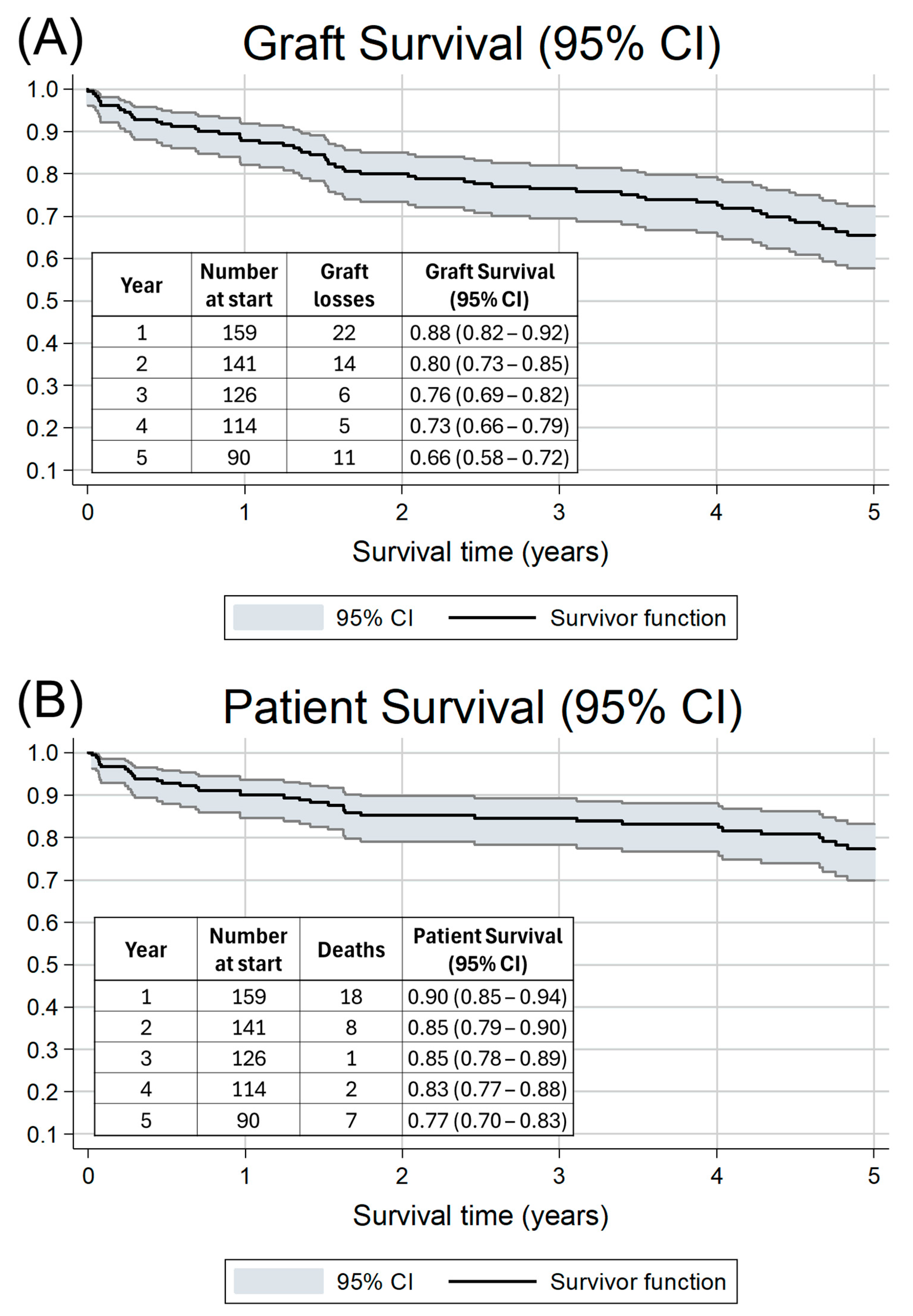 - Davidson, B.; Du Toit, T.; Jones, E.S.; Barday, Z.; Manning, K.; Mc Curdie, F.; Thomson, D.; Rayner, B.L.; Muller, E.; Wearne, N. Outcomes and challenges of a kidney transplant programme at Groote Schuur Hospital, Cape Town: A South African perspective. PLoS ONE 2019, 14, e0211189. [Google Scholar] [CrossRef] [PubMed]