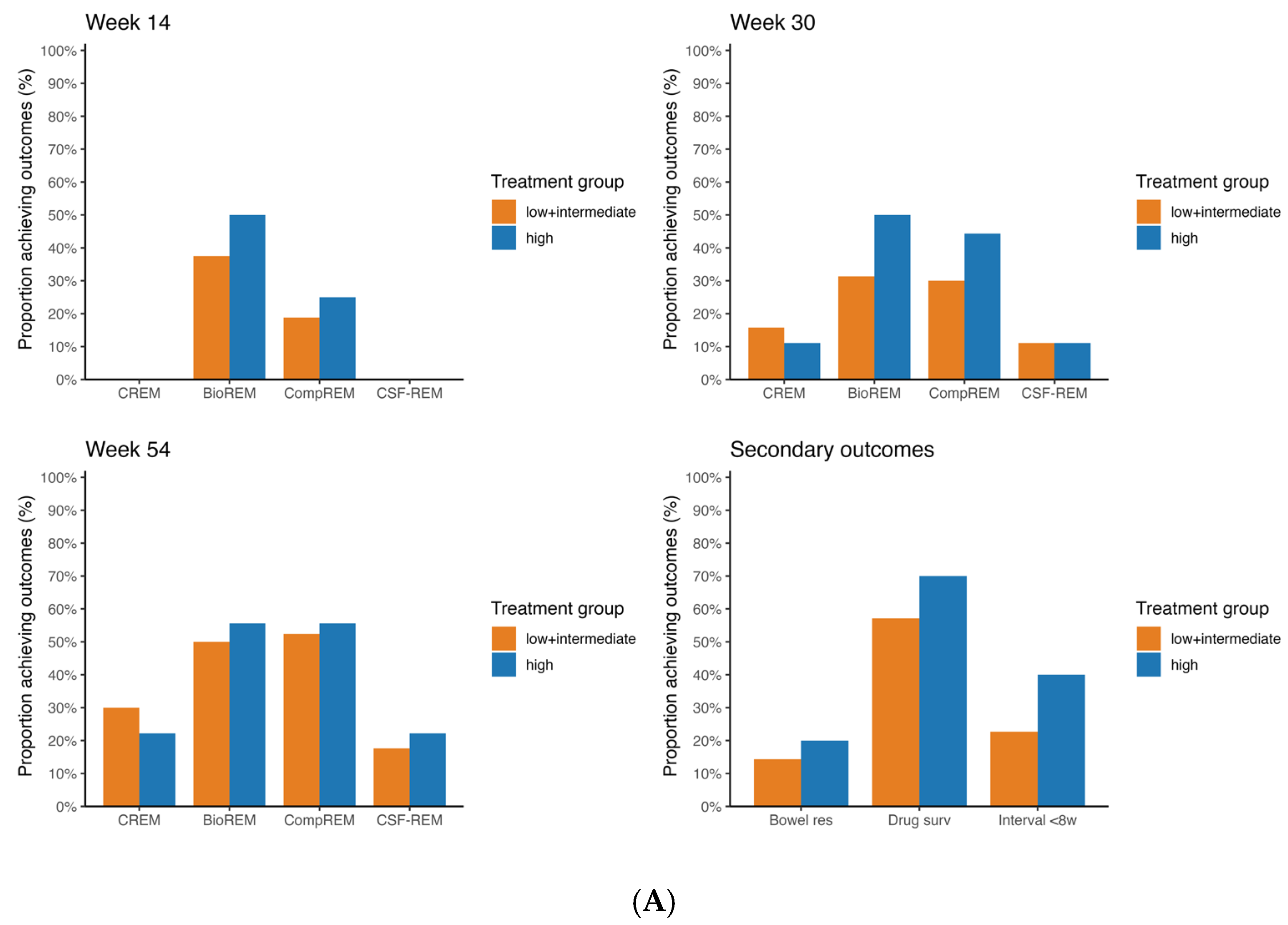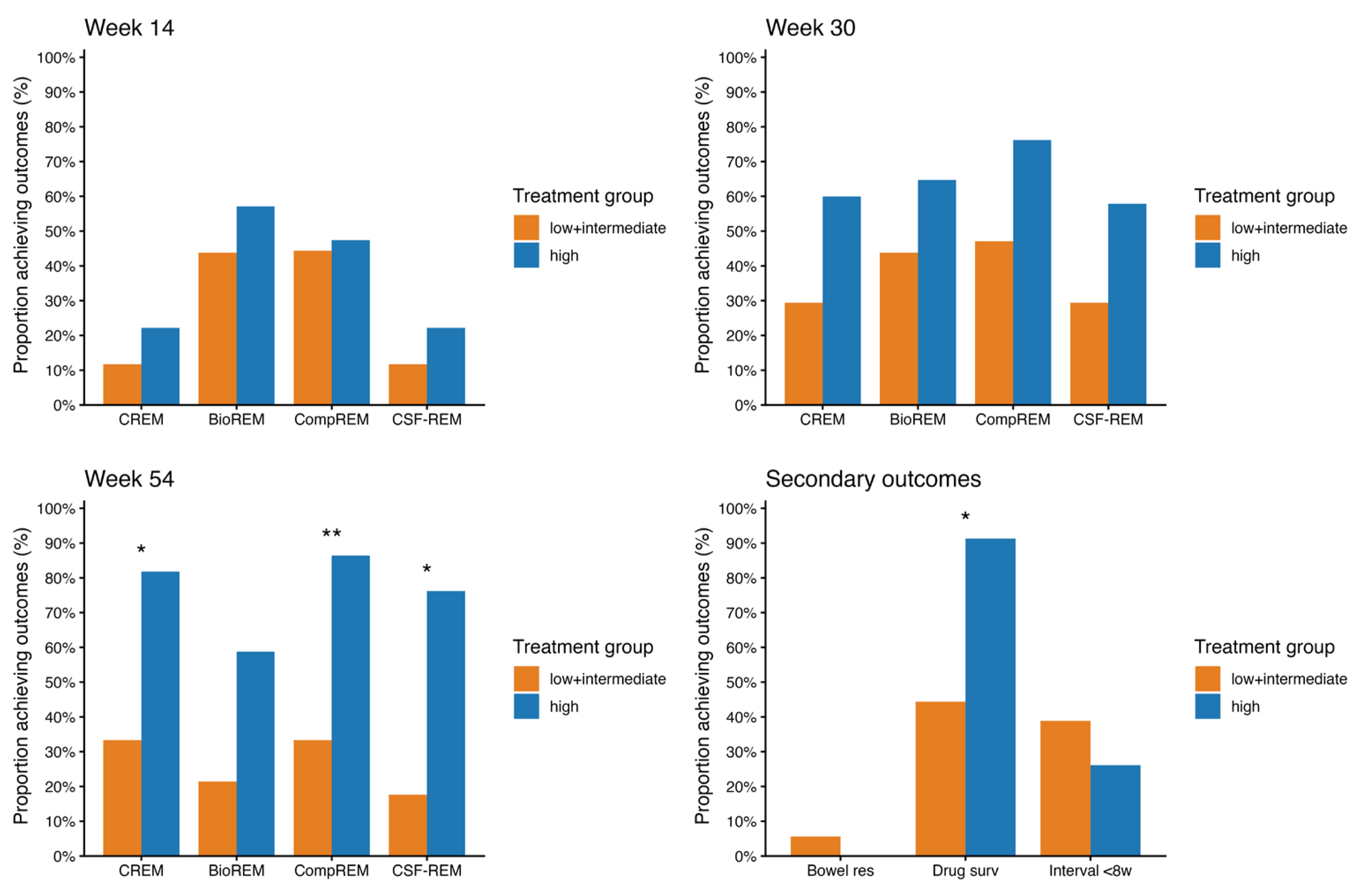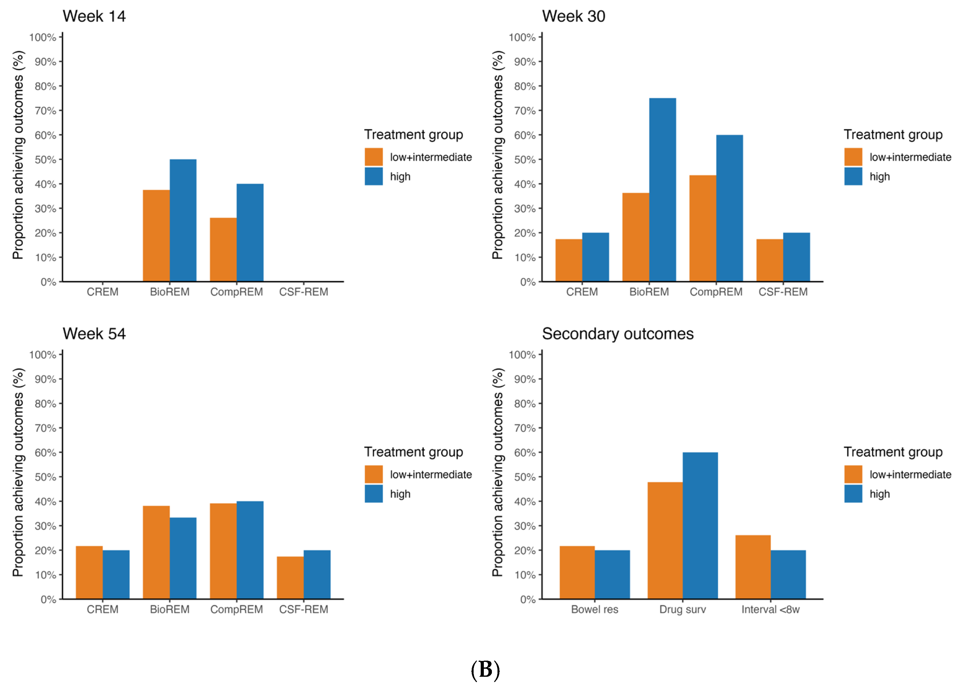 Figure 3 show the rates of CREM, BioREM, CSF-CREM and CompREM at week 14, 30 and 54 along with the number of patients that were included at each outcome.