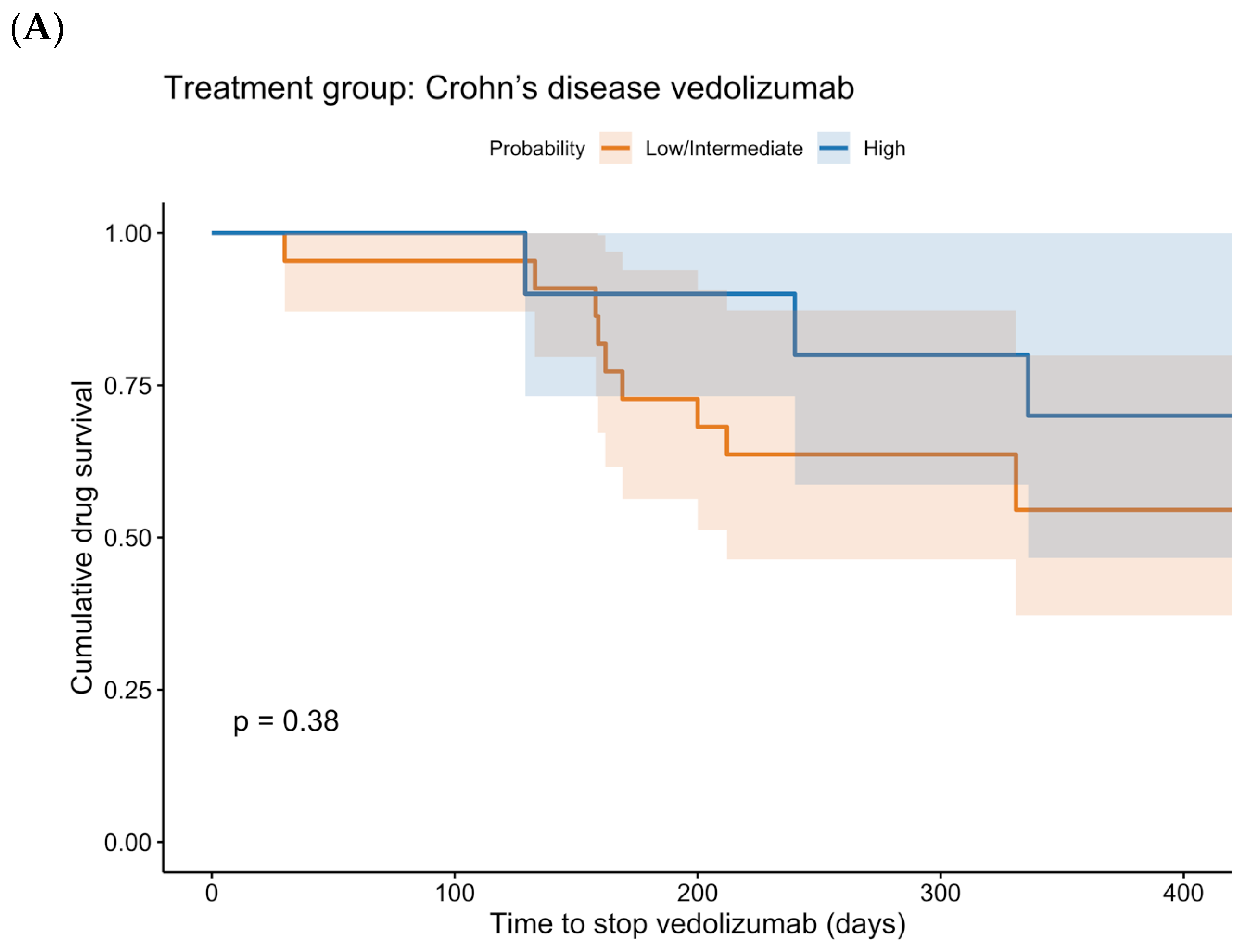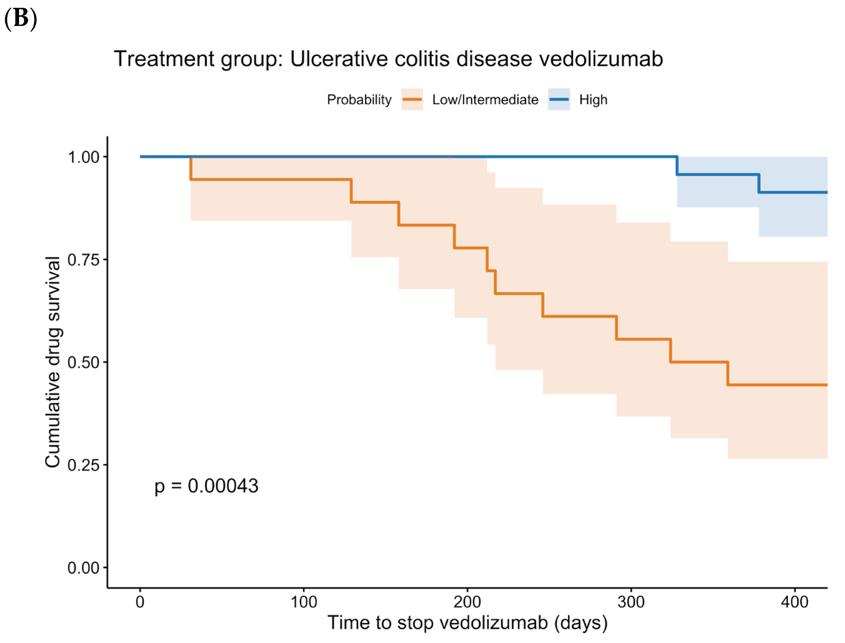 Figure 4. These curves show a statistically significant difference between low + intermediate probability and high probability for UC patients treated with vedolizumab (