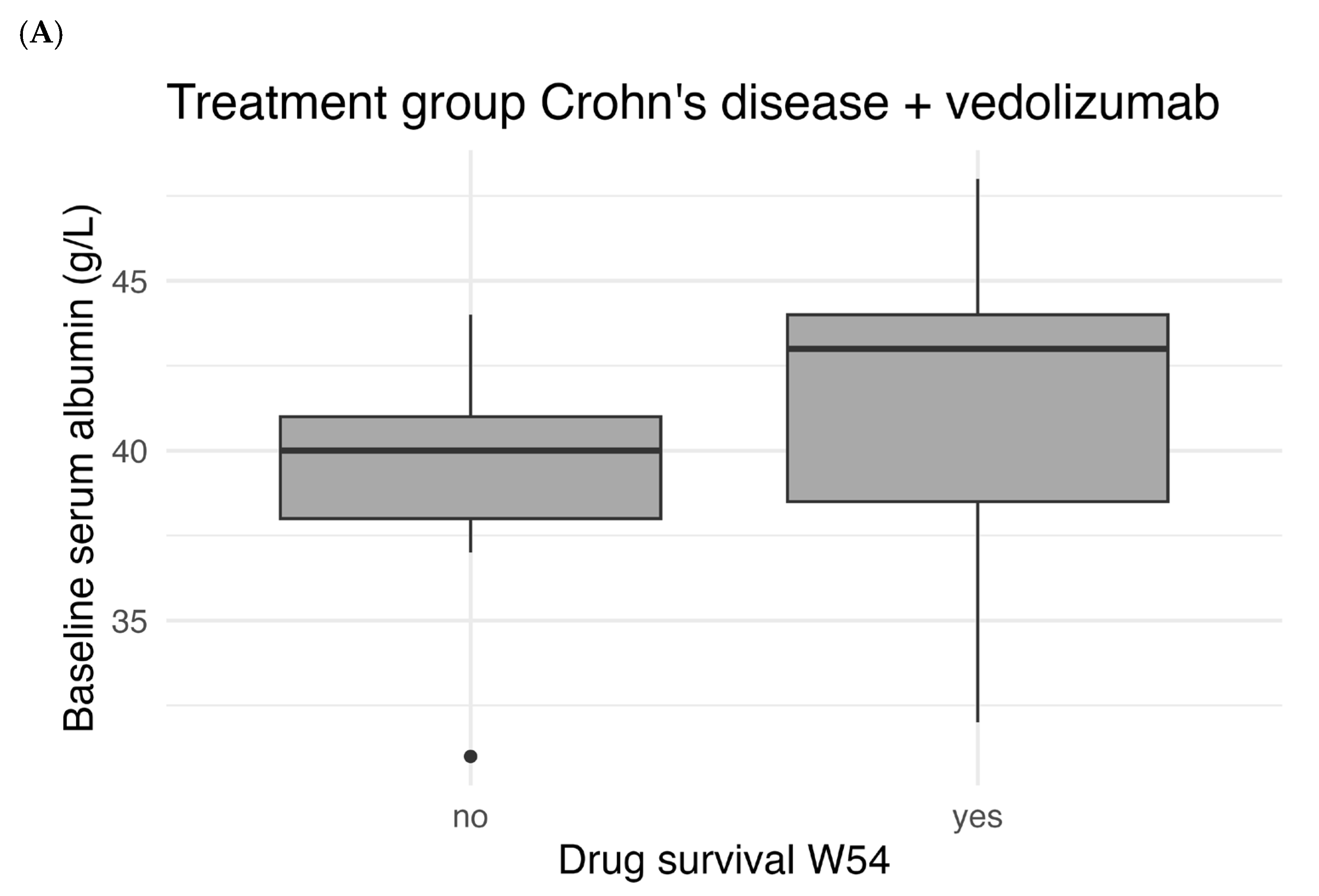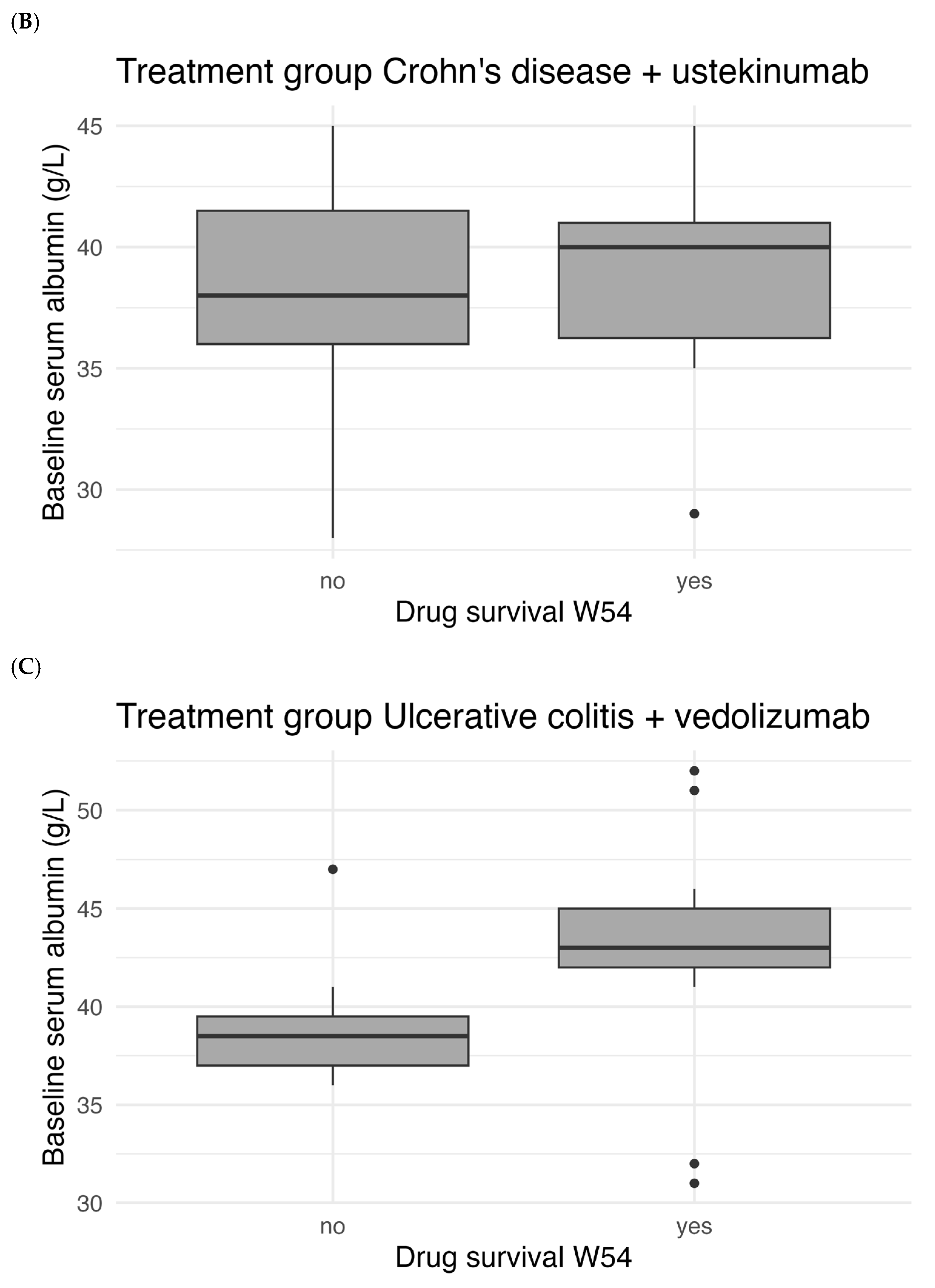 Figure 5 shows the correlation between baseline serum albumin levels and drug survival. There was a statistically significant difference in median baseline albumin between patients with and without W54 drug survival for UC patients treated with vedolizumab (