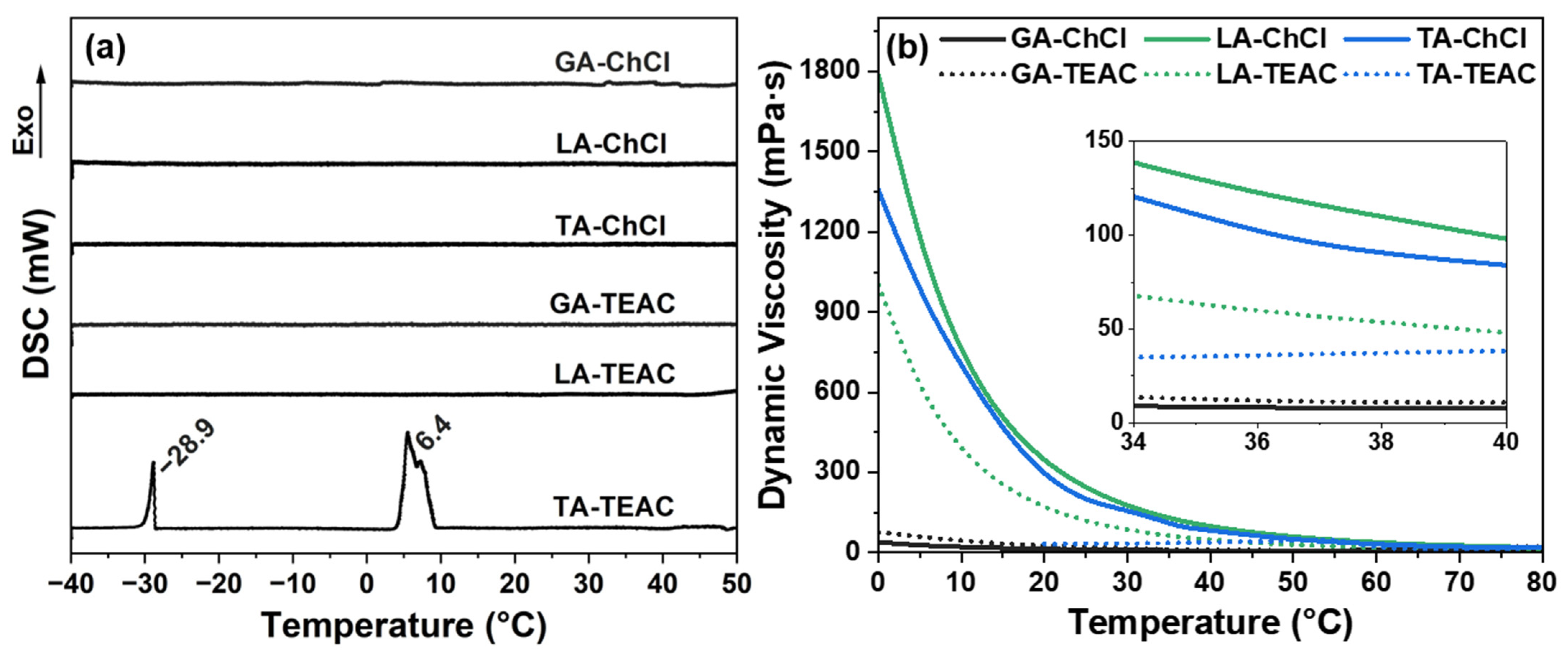 - Fan, J.; Pan, Y.; Gao, D.; Qu, H. Experimental Study on the Transport Properties of 12 Novel Deep Eutectic Solvents. Polymers 2024, 16, 1946. [Google Scholar] [CrossRef] [PubMed]