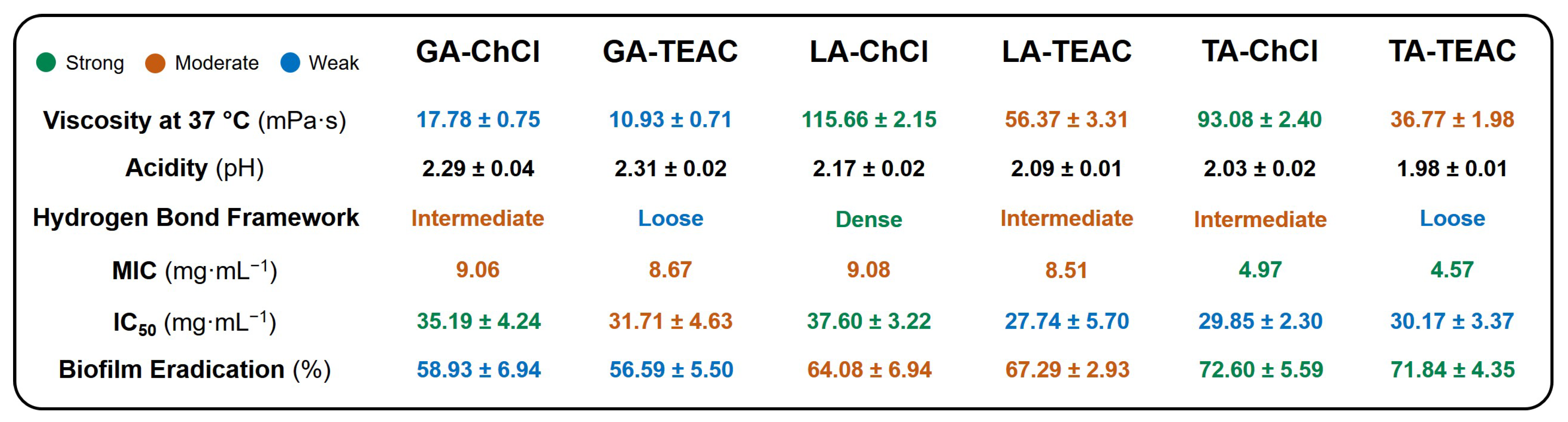 - Swebocki, T.; Kocot, A.M.; Barras, A.; Arellano, H.; Bonnaud, L.; Haddadi, K.; Fameau, A.; Szunerits, S.; Plotka, M.; Boukherroub, R. Comparison of the Antibacterial Activity of Selected Deep Eutectic Solvents (DESs) and Deep Eutectic Solvents Comprising Organic Acids (OA-DESs) Toward Gram-Positive and Gram-Negative Species. Adv. Healthc. Mater. 2024, 13, 2303475. [Google Scholar] [CrossRef]