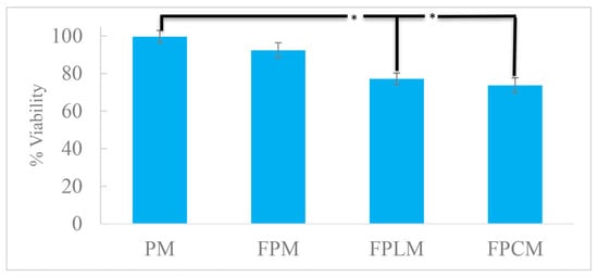Cell viability of the MCF-7 cells exposed to the fabricated NPs for 24 h, showing the minor toxicity of FPLM and FPCM (n = 3, *—p < 0.05).