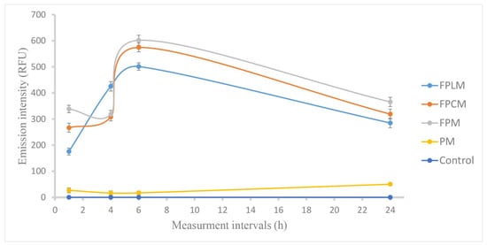 Cell internalization of FPM, FPSM, and FPLM to the MCF-7 cells by time, based on the fluorescence intensity of FITC conjugated to PLGA reported as RFU values, showing the maximum internalization of NPs at the end of 6 h. PM and non-treated cells (control) were used to measure solely the fluorescence of FITC (n = 3).