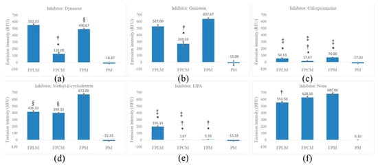 Cell internalization ratios of FPLM, FPCM, FPM, and PM on MCF-7 cell lines with (a) dynasore, (b) genistein, (c) chlorpromazine, (d) MβCD, (e) EIPA, and (f) no inhibitor. Statistical significance is shown by *—p < 0.001, more inhibited compared to the internalization of the same NP without inhibitor, §—p < 0.05 more inhibited compared to the same NP without inhibitor, †—p < 0.001 the most inhibited NP within the same inhibitor group, and ‡—p < 0.001 most effective inhibitor against the same NP group. The PM was used as the negative control in all assays (n = 3).