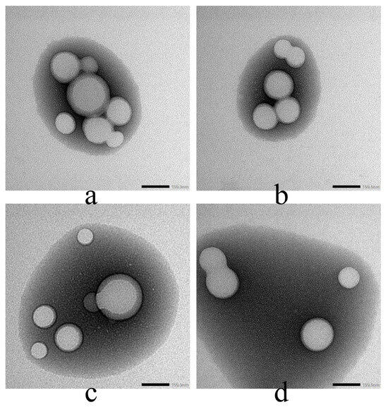 The TEM images of (a) PM, (b) FPM, (c) FPLM, and (d) FPCM, Image acquired at 40,000× magnification; scale bar = 100 nm.