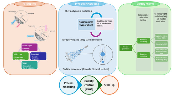 - Microscopic approach: focuses on local interactions, such as how droplets interact within the spray zone and how tablets move, aiming to improve coating uniformity at a more precise level.