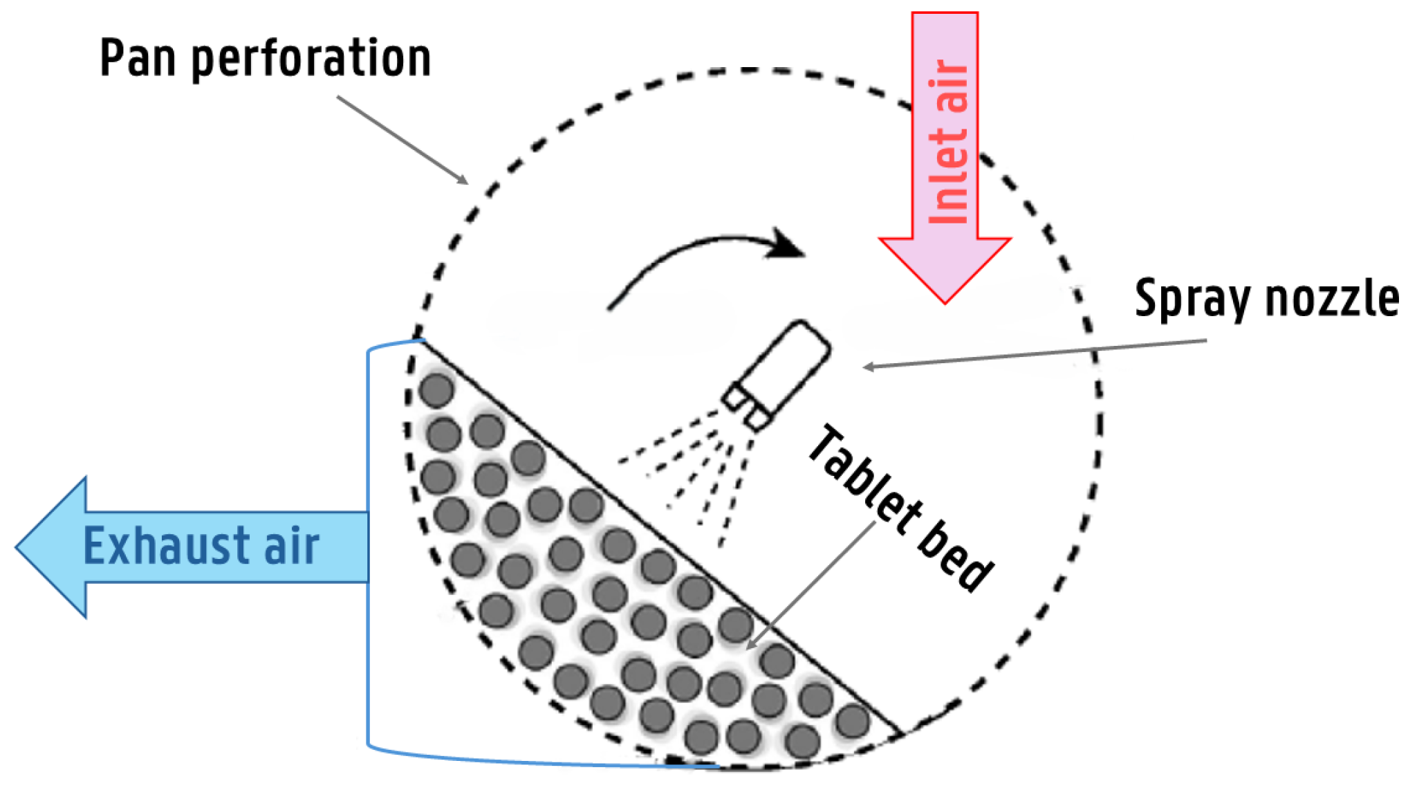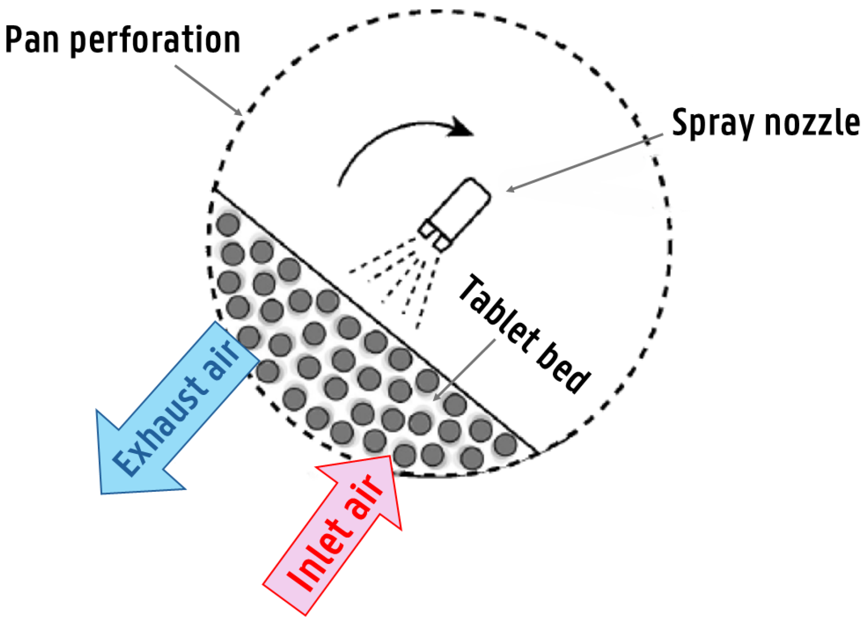 - Pan speed:An optimal pan speed is essential to ensure uniform tablet movement, which in turn results in a uniform coating distribution. In general, the highest pan speed that does not cause defects such as tablet breakage or sticking should be used to enhance mixing and reduce coating variability. It is important to continuously monitor and adjust tablet movement throughout the coating process, as the application of the coating alters the tablet surface, increasing the degree of slip of the tablets and potentially affecting movement dynamics [23].