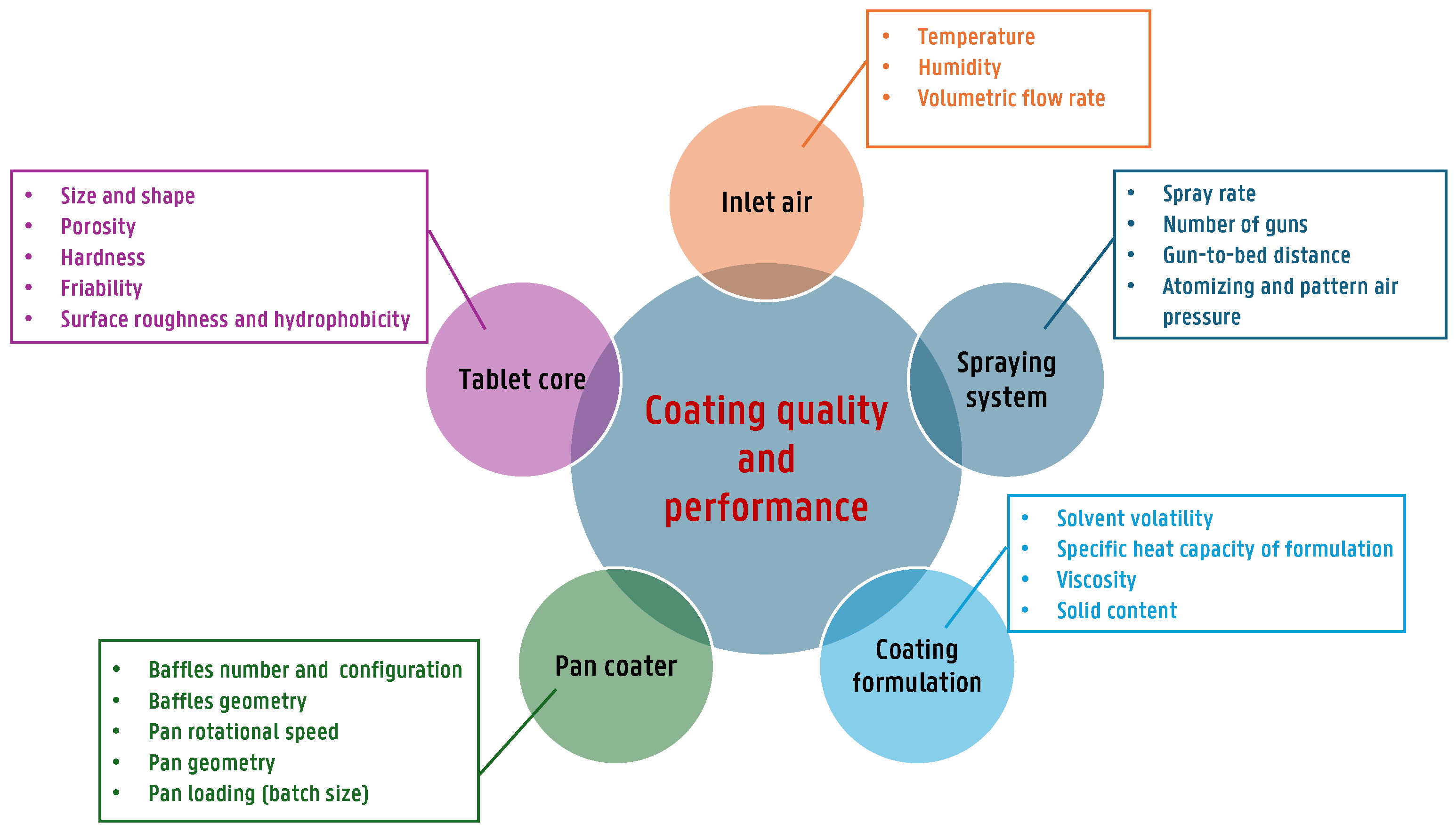 | Thermodynamic Modeling | Simulates coating process through coupled mass and energy balances between air, spray, and tablet bed. | •
