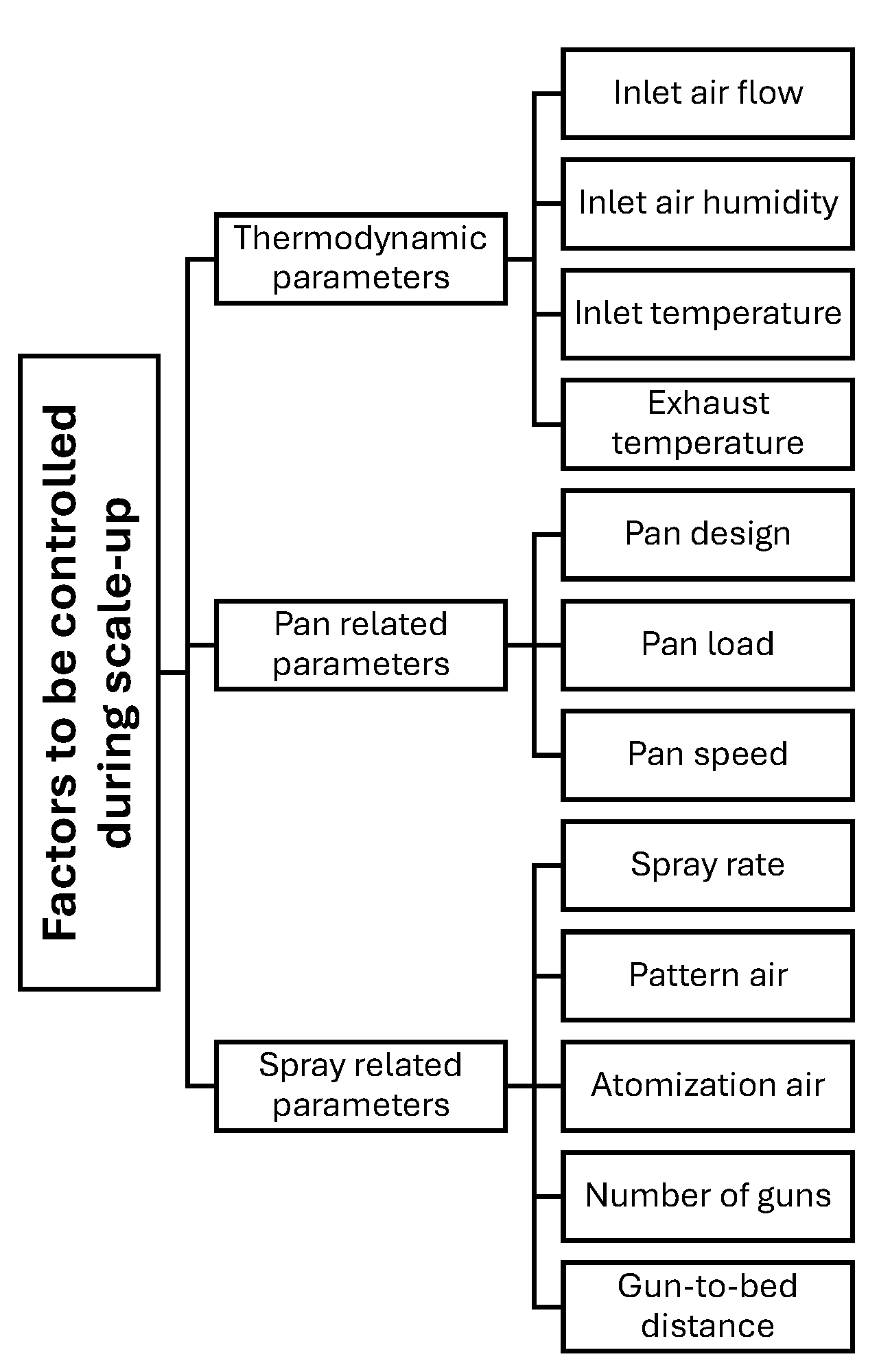 - Macroscopic approach: considers large-scale factors like heat and mass transfer, pan geometry, and spray rate to ensure consistent conditions across different scales.