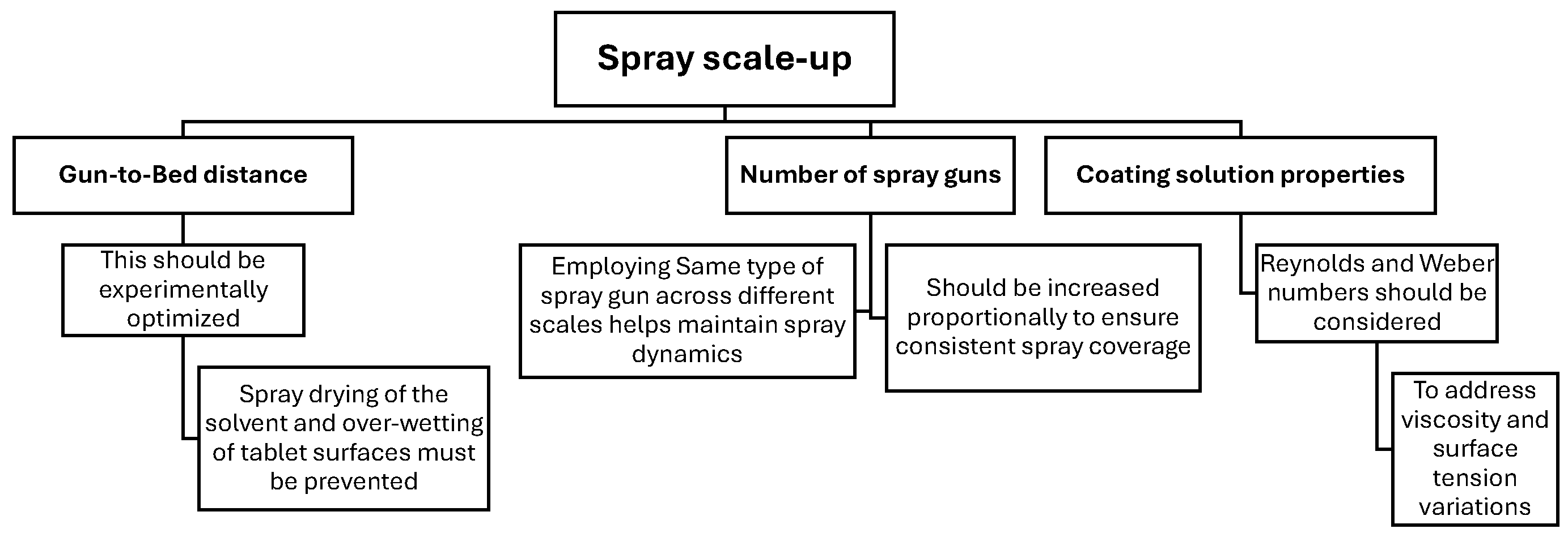 | Prpich et al. [66] | Same as am Ende et al. 2005 [54]. | Same as am Ende et al. 2005 [54]. | Only aqueous film coating. Bi-conical coaters such as Glatt GC 1250, etc. | Adaptation of am Ende & Berchielli (2005) [54] model to different coater types. |